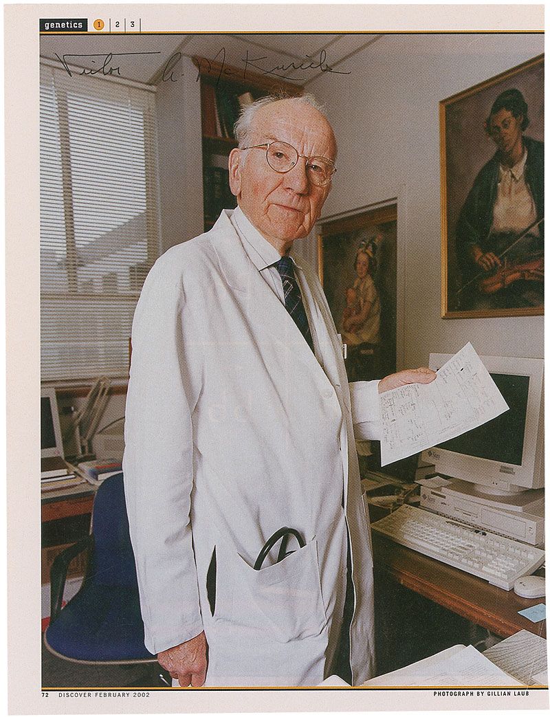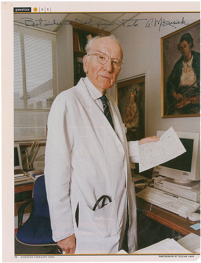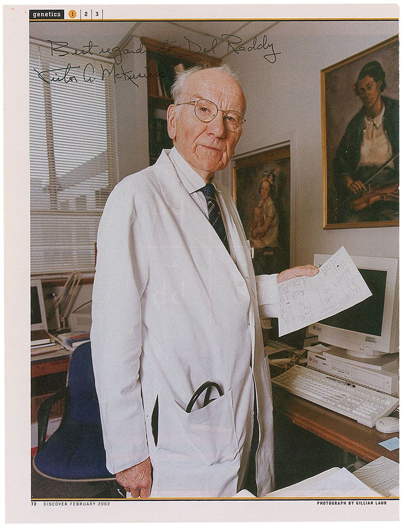 Geneticist (1921–2008) widely regarded as the father of clinical medical genetics. Three identical color 8 x 10.5 magazine photo from the February 2002 issue of Discover, each signed in black ink, with McKusick inscribing one of the photos. In fine condition.