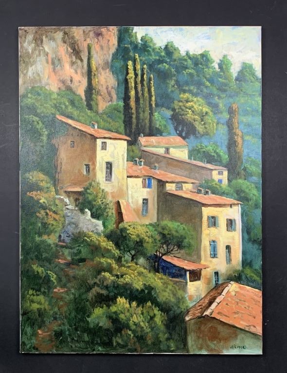 Victor Nemo's "Contignac Franch" original acrylic on canvas painting, circa 2002, signed lower right. This piece is of a few homes on the side of a hill, surrounded by luscious green trees. This piece has been professionally stretched over a stretcher board, and is in excellent condition.