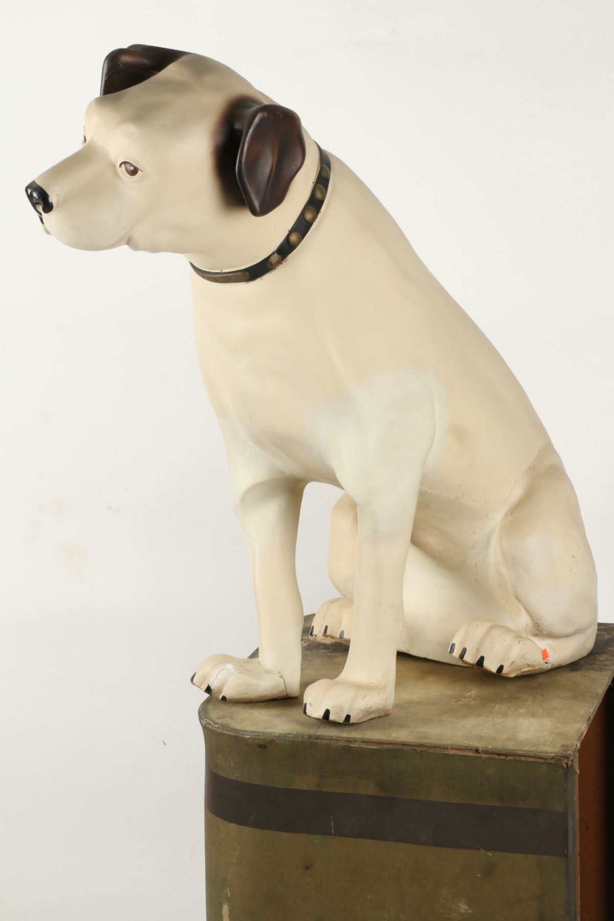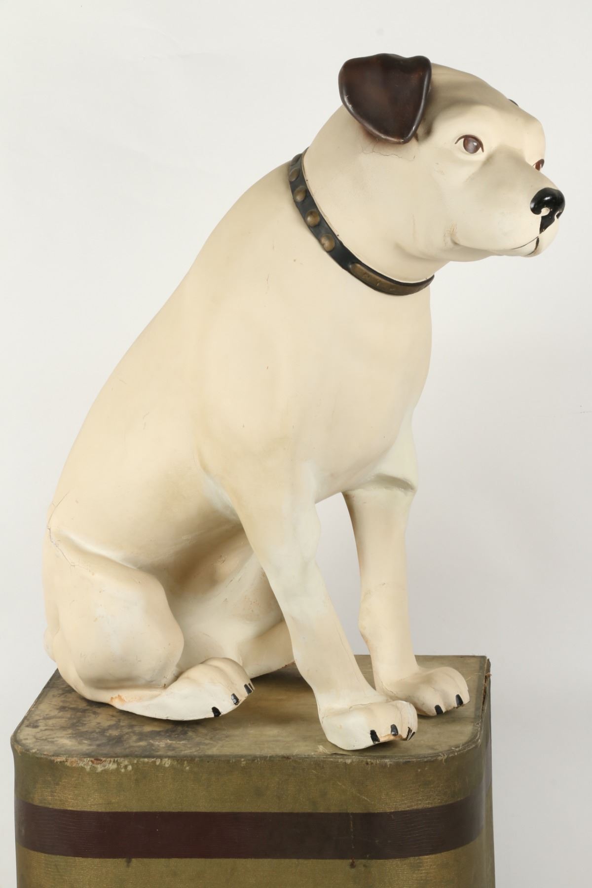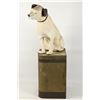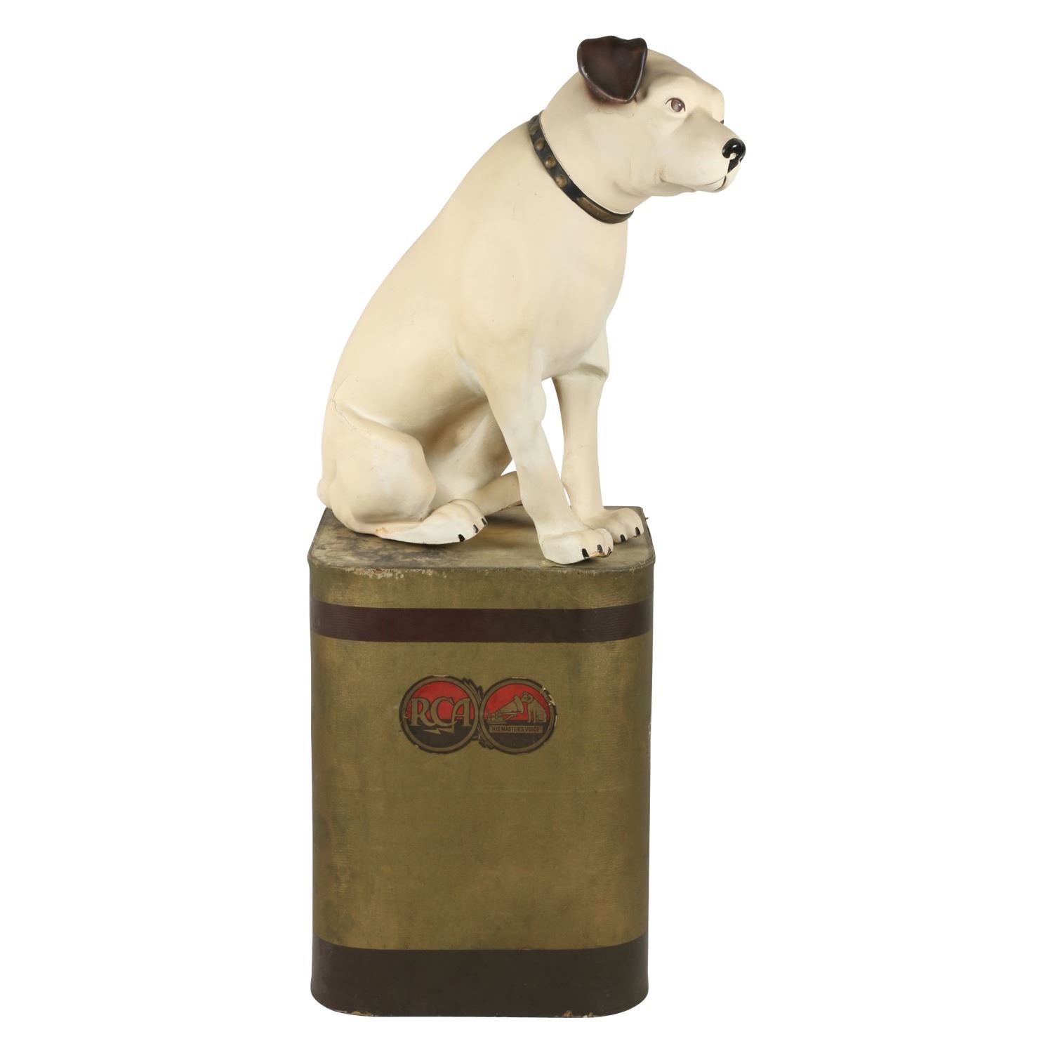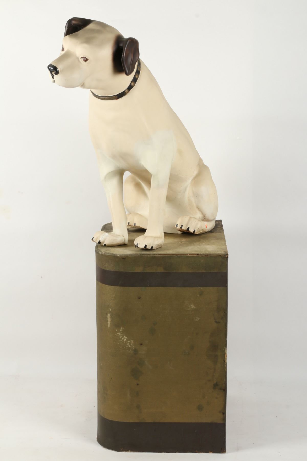 Composite RCA Victor "Nipper" mascot store display. Collar marked "NIPPER". Formed composite. Includes RCA/His Master's Voice canvas wrapped display pedestal. Dog - 30" x 24" x 12", Stand 208" x 20" x 18". Scattered stress lines with some restoration. A few broken pieces from the underside, away from sight. $400-600.