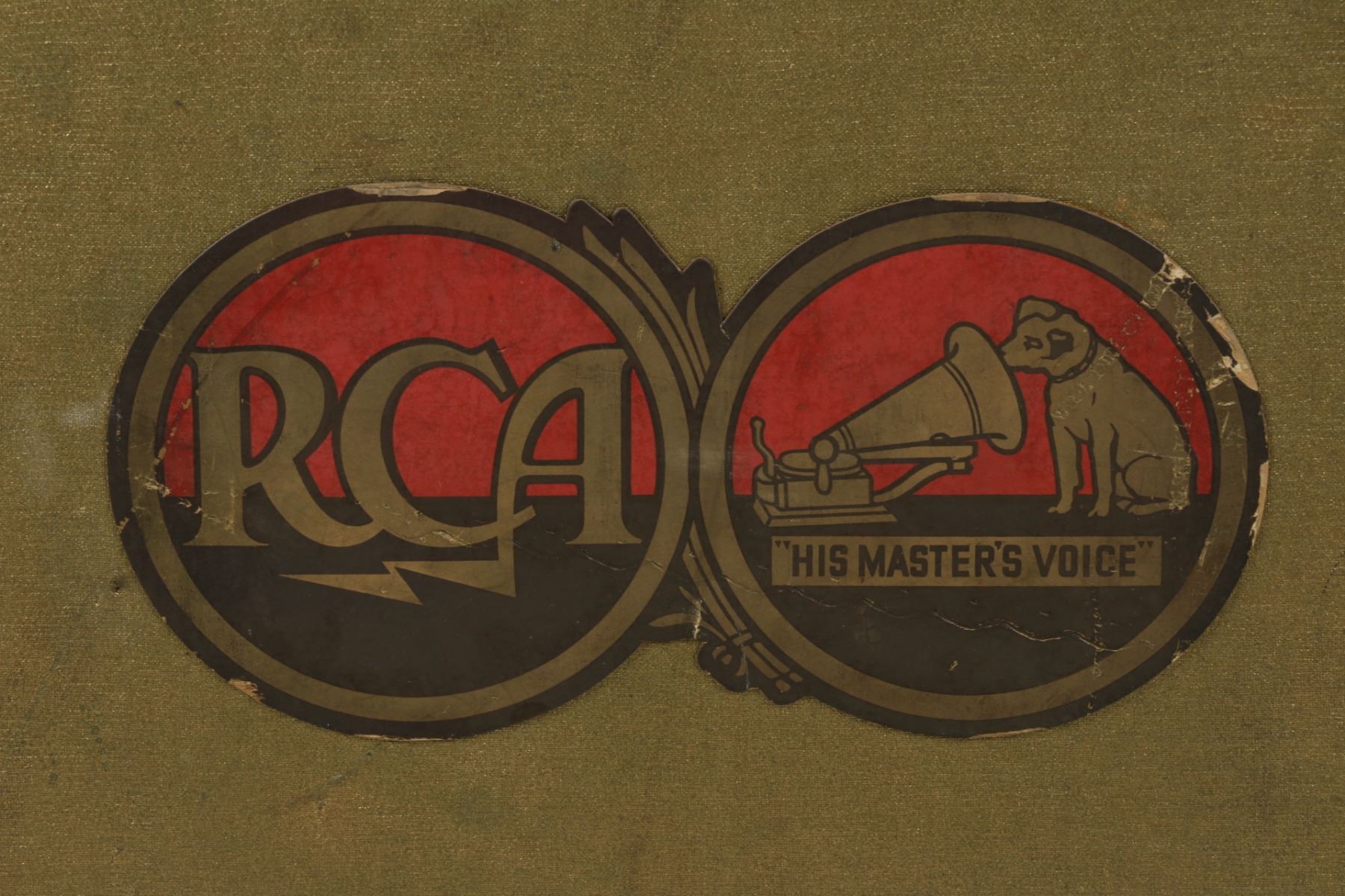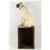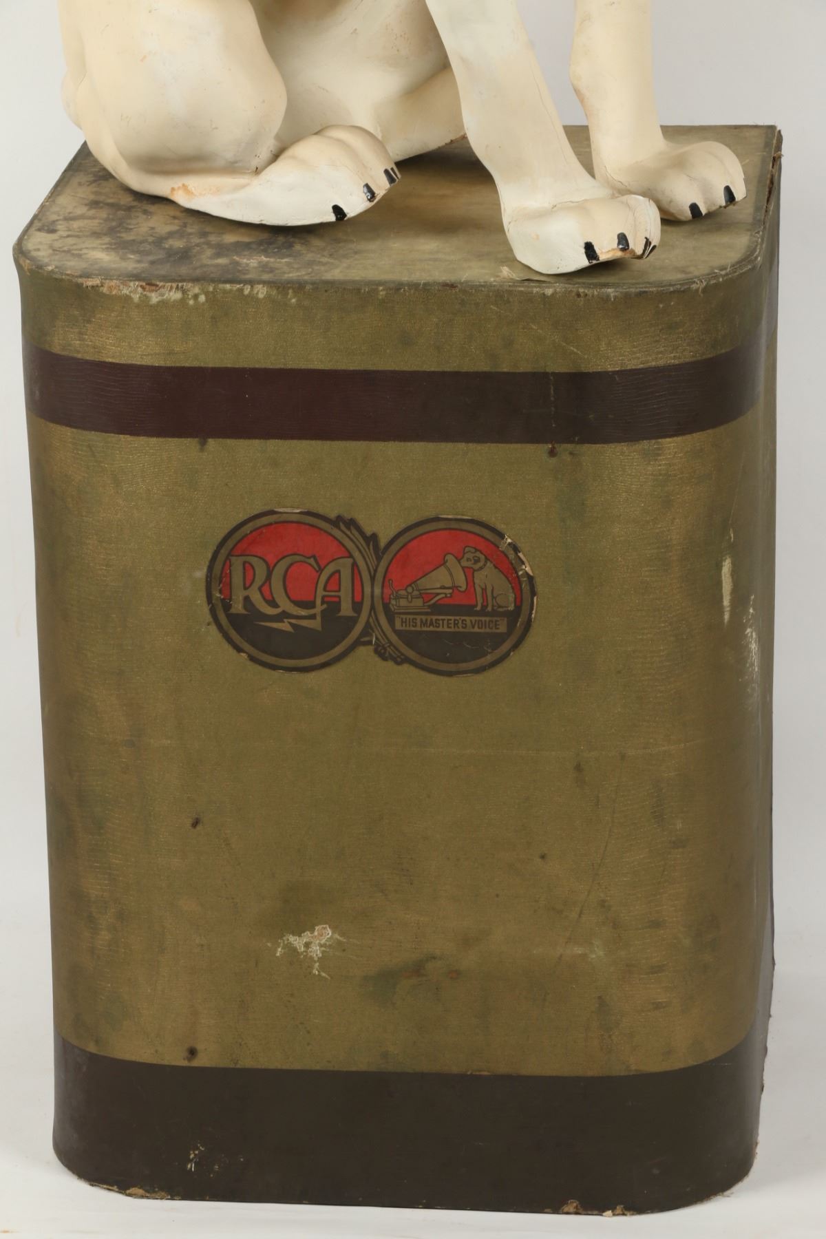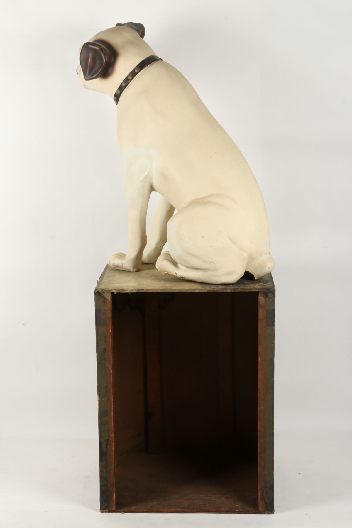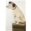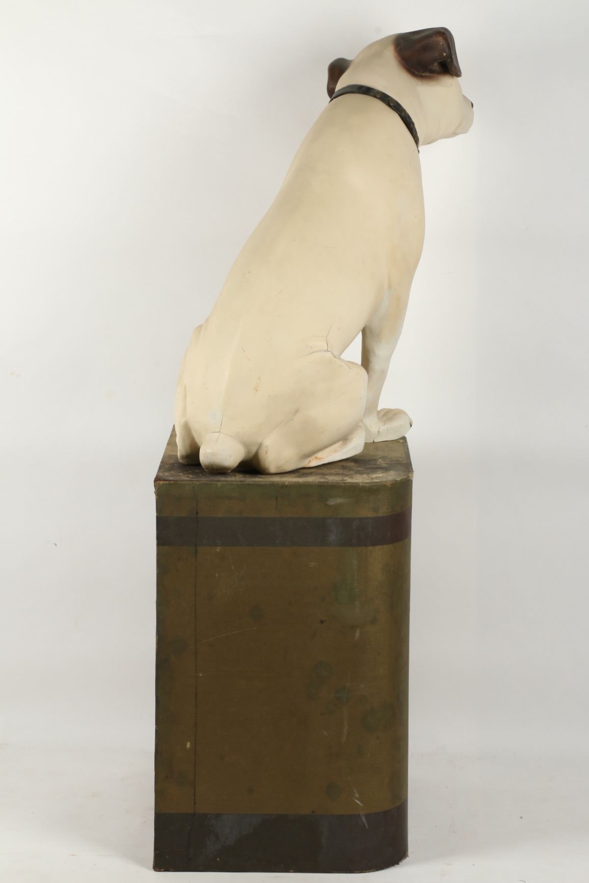 Composite RCA Victor "Nipper" mascot store display. Collar marked "NIPPER". Formed composite. Includes RCA/His Master's Voice canvas wrapped display pedestal. Dog - 30" x 24" x 12", Stand 208" x 20" x 18". Scattered stress lines with some restoration. A few broken pieces from the underside, away from sight. $400-600.