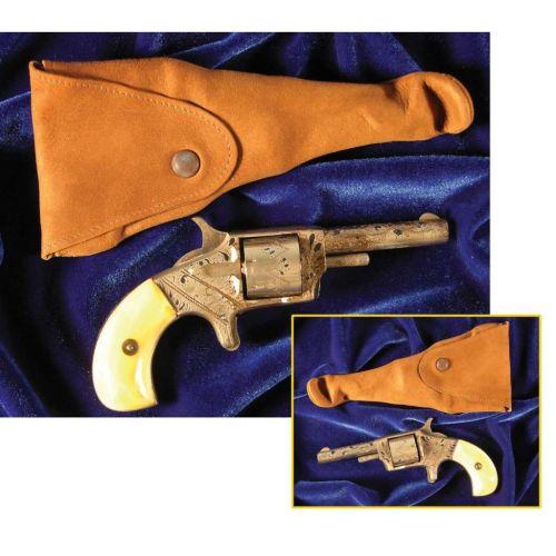 Victor Number 1, 22 cal. Derringer, engraved with ivory grips and original leather case, dated 1871. Some minor surface rust otherwise very good condition. 6 inches long.