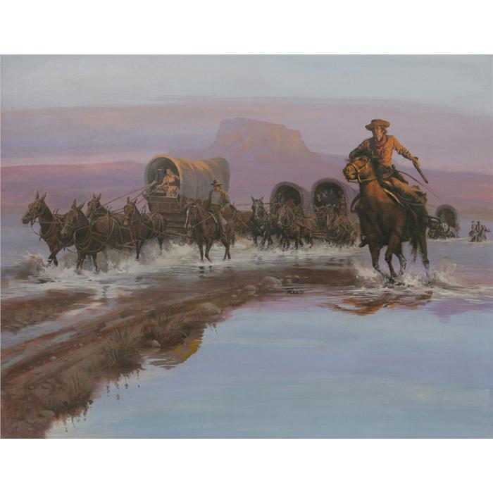 Victor Prezio (late 20th century). Crossing the Cimmaron River. 24" x 30" oil on board. Signed center (est $2,000-3,000)