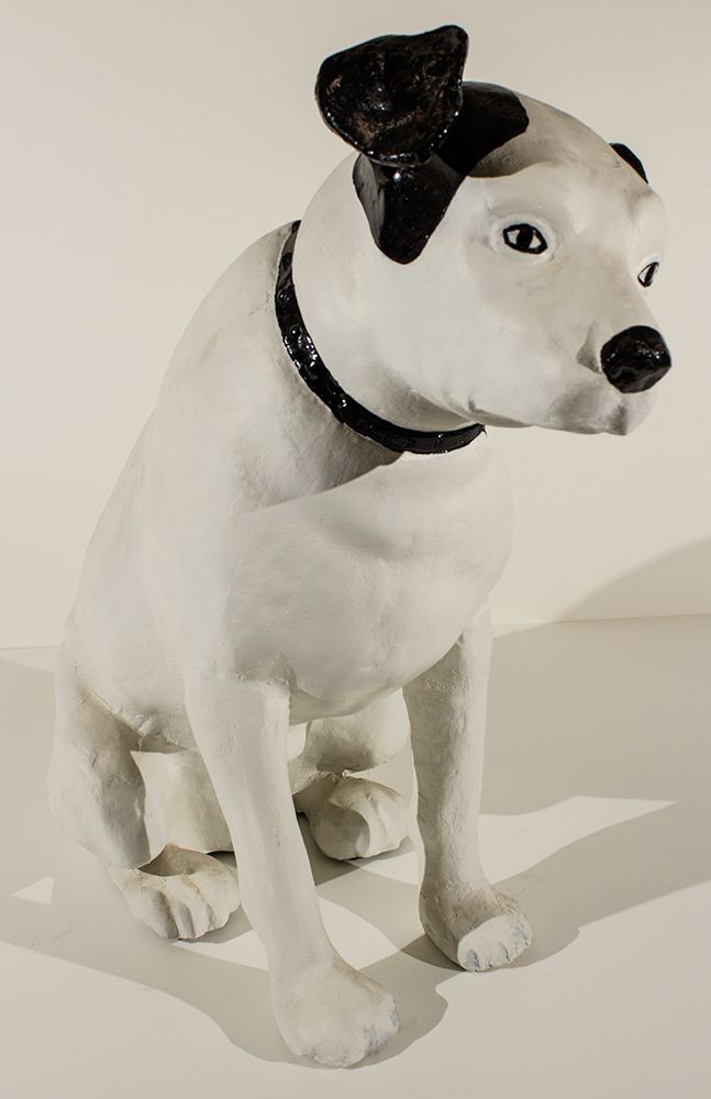 c1900 Large model of the world-famous gramophone dog, affectionately known as "Nipper." This life-like restored model measures 38" high, 36" long (nose-to-tail) and 12" wide at the shoulders. The real "Nipper" was probably a terrier mix, who died in 1895. He was the model for the famous Francis Barraud painting "His Master's Voice," of the dog looking intently into a gramophone. This image later become the logo for several audio recording brands, most notably Victor and RCA. This is a famous nad historic period piece. Gordon Harris Estate - HKA#66088