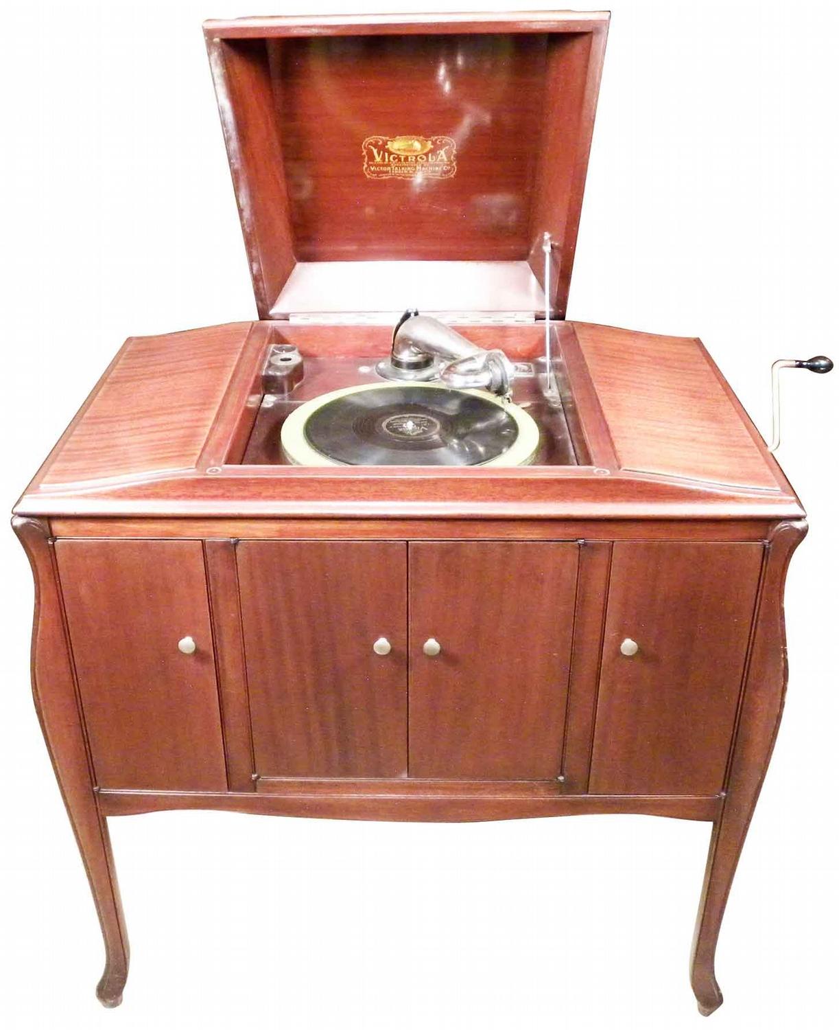 Victor Talking Machine, console model "hunchback" style. Model VV-260, serial #21366. Walnut case. Comes with records and needles. Excellent working condition. 34 X 35 X 22 1/2 inches.