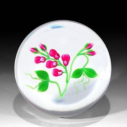 Victor Trabucco 1981sweet peas paperweight, containing a vine with pink sweet pea flowers, pink buds, green leaves, and tendrils, on clear ground. "VT" signature cane. Signed/dated. Edition # 16 of a limited edition of 50. Diameter 3".