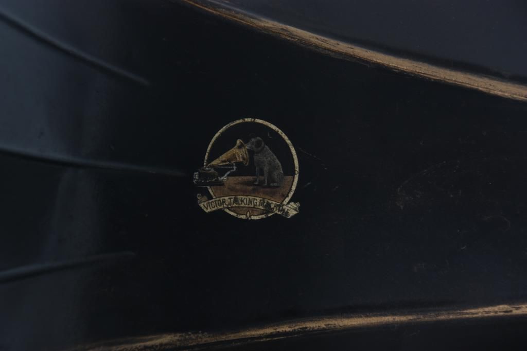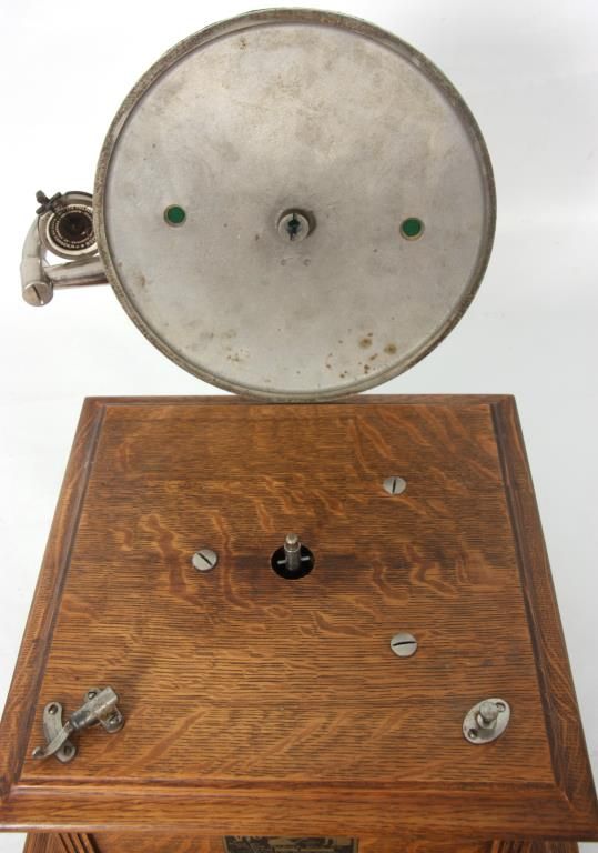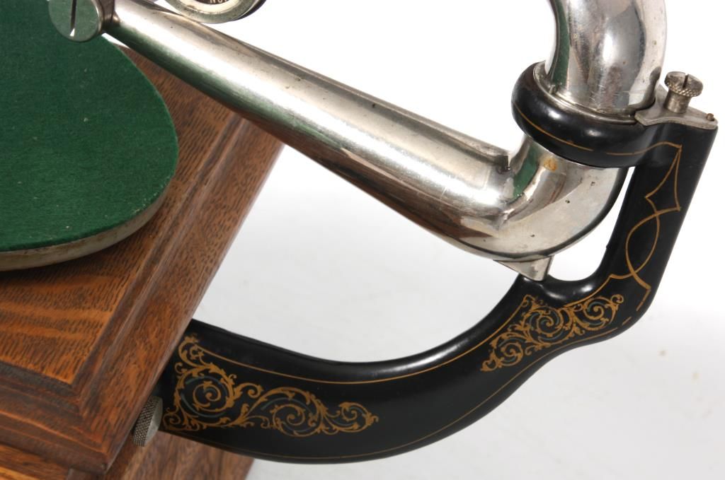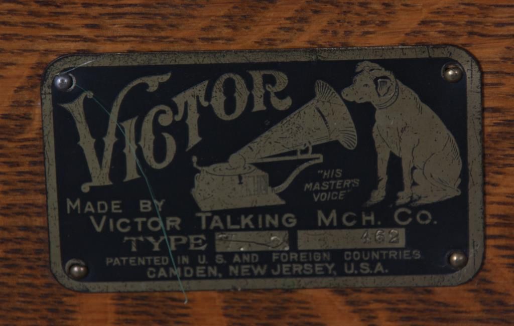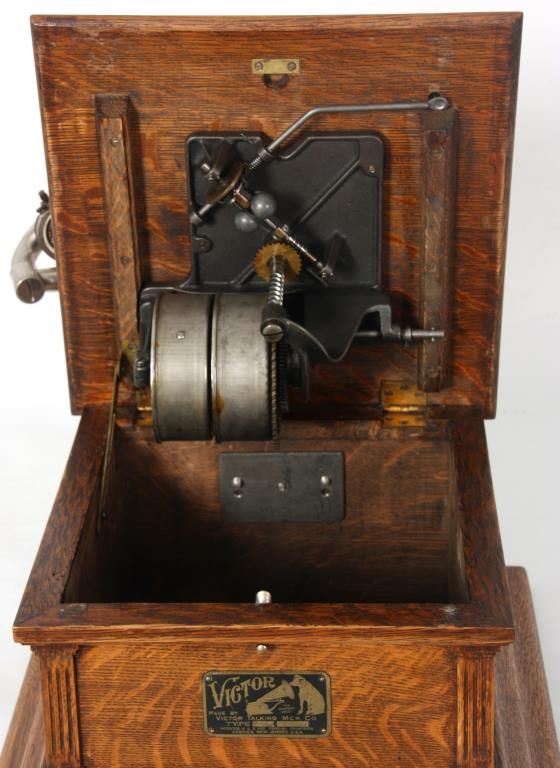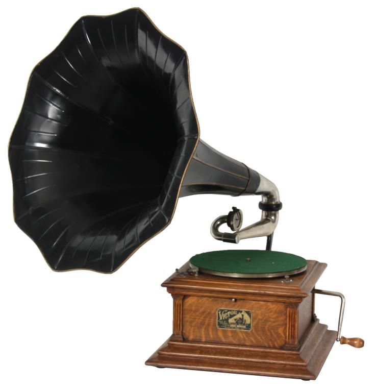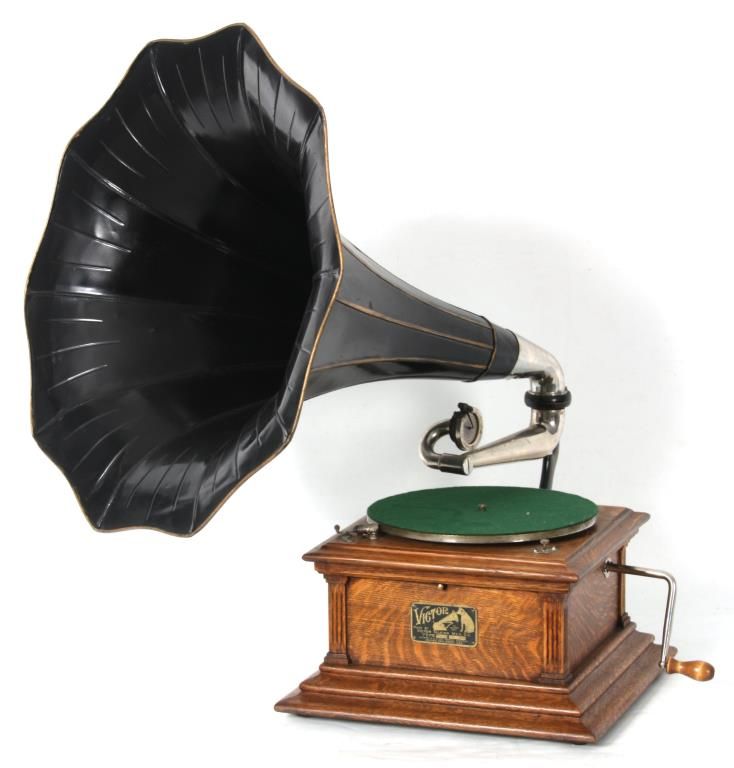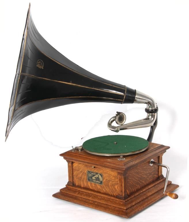 Victor Type III Oak Phonograph. Quarter sawn oak case with fluted corner pilasters, 10 in. spring driven turntable with crank on the right side, rear mounted support arm is painted black with gilt stenciling; nickel silver tone arm with Exhibition style receiver and large 10 panel horn with lobed rim, painted black with gilt highlights and original decal, measures 21 in. long x 22 in. dia. Signed on a brass tag “Victor Talking Mch. Co.” type V. 3 and serial number 462. Overall dimensions 29 in. high x 14 in. wide x 27 in. deep.