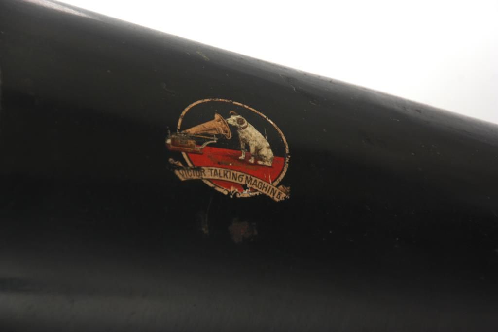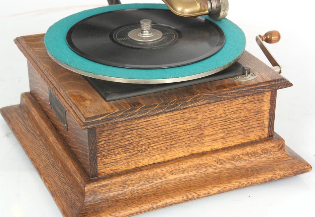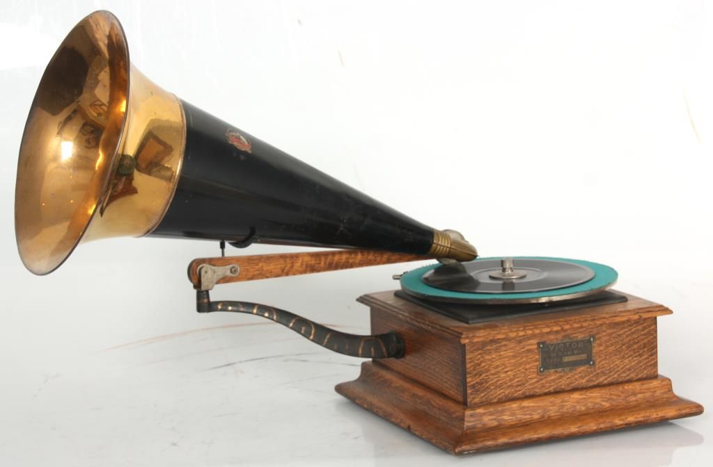 Victor Type P Front Mount Phonograph. Oak case has splayed trim at the base, 10 in. spring driven turntable, front mounted support arm with oak stick tone arm. The horn has a flared brass bell with black painted cone and original decal, 19 in. long x 11 in. dia. Signed on a brass tag Victor Talking Machine Co., type P and serial number 356; in good running condition, springs wind, turn table rotates. 19 in. high x 12.5 in. wide x 29 in. deep