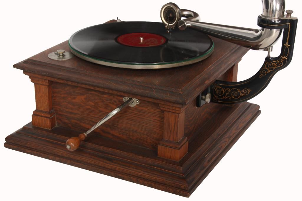 Victor Type-V Oak Phonograph. Oak case has square corner columns, rear mounted horn with black painted iron support arm and gilt stenciling, has a nickel-silver tone arm with Exhibition style reproducer, 12 in. spring driven turn table and signed on a metal tag Victor Talking Mach. Co. Type V and serial number 29217. Oak Music Master Phonograph Horn. Formed from 16 long bent oak panels with an oak strap around the bell and a black band painted around the center; signed with Music Master, lyre and banner decal. 26 in. long x 21 in. dia. In good condition and original finish. Overall dimensions 32 in. high x 16.5 in. wide x 26.5 in. deep.