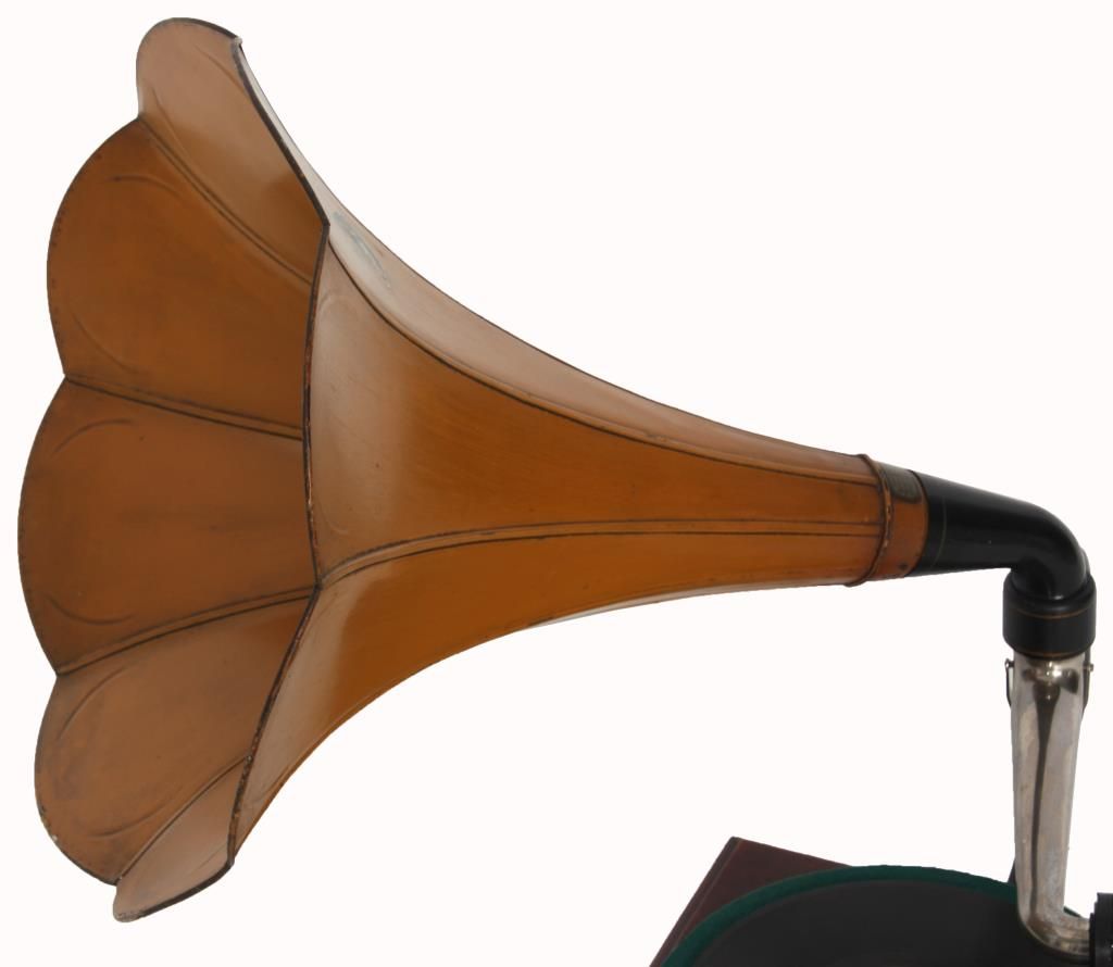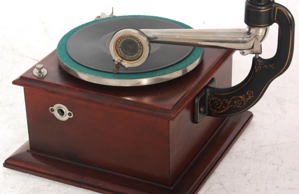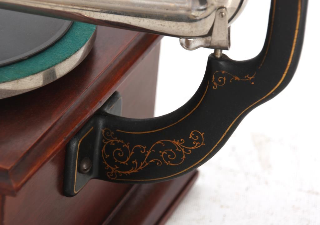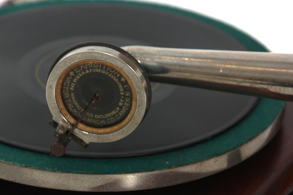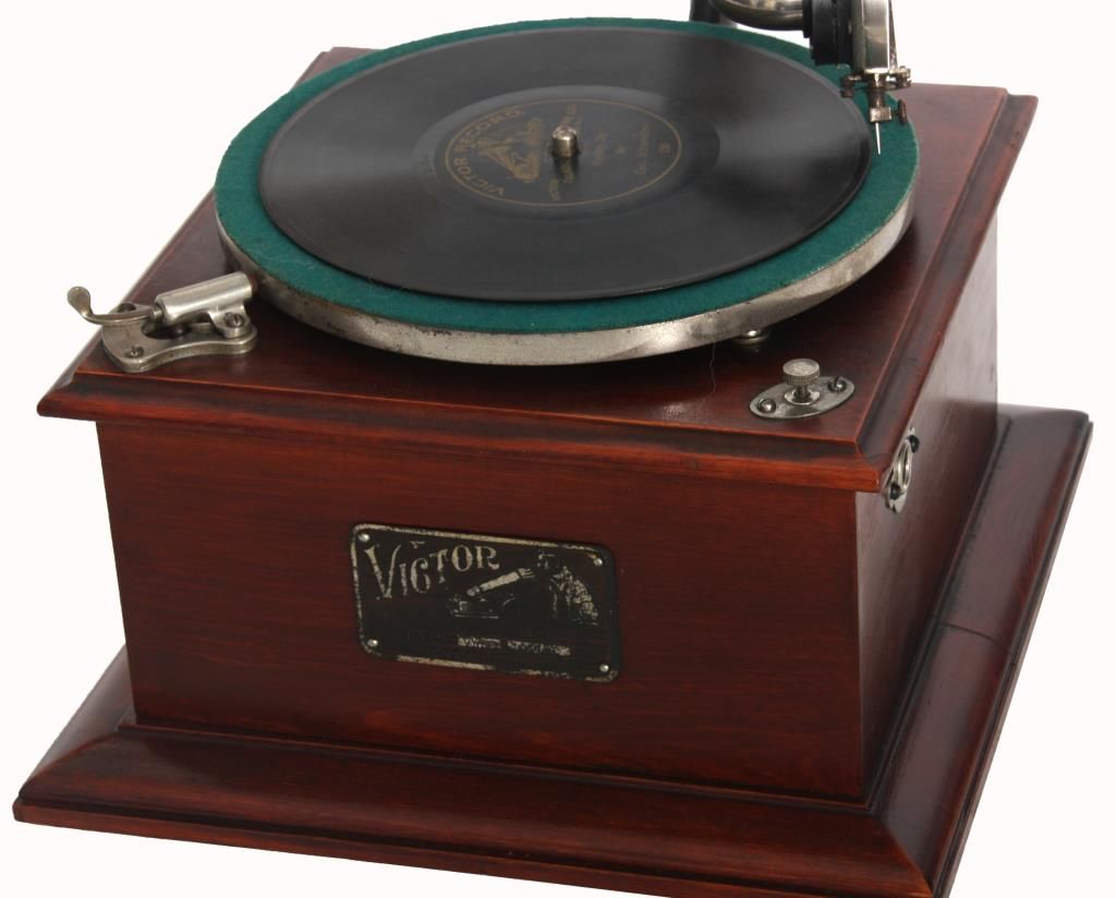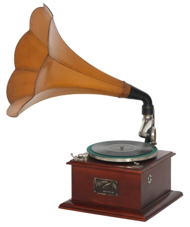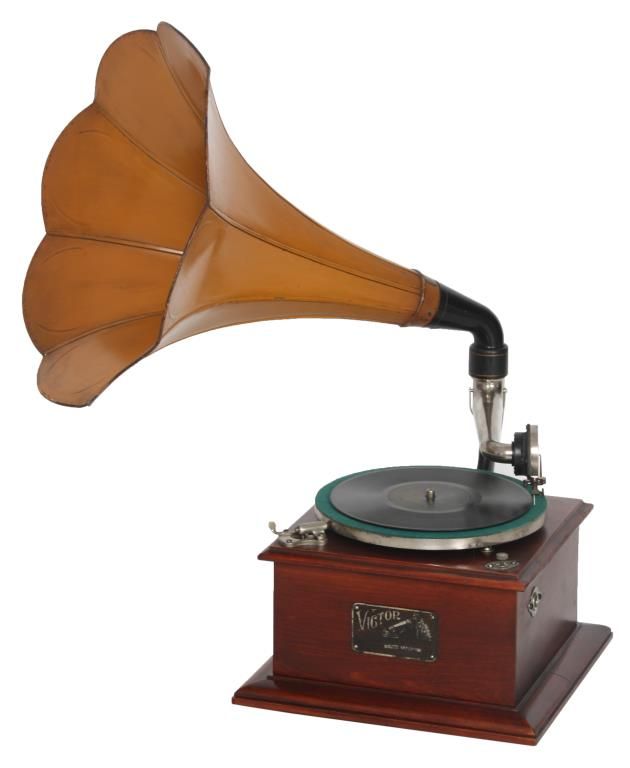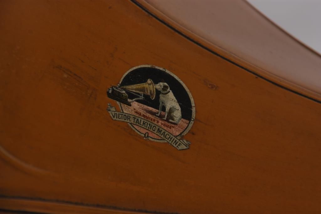 Victor Type Vic-O Victrola. Square mahogany case with 8 in. spring driven turn table, black painted arm mounted on the side with gilt decoration, has a silvered tone arm mounted below the black painted brass horn receiver; the original 8 panel horn has a scalloped edge with original mustard colored paint and Victor decals, horn measures 14 in. long x 13 in. dia. Signed on a metal tag on the front Victor Talking Machine Co. with model number Vic. O and serial number 1011A; missing crank. Total height 23 in. case measures 10.5 in. square.