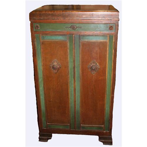 Victor VV Console Phonograph. Brown wood case with green accents measures approximately 25" x 19" x 46" H. Wood appliques across top and around door knobs. Record storage area behind doors. Marked inside on brass plaque: Victor Talking Machine Co. VV 8-9 4320. Nice decal on inside lid. Brass plate indicating seller as M.S.Lason & Son, Malone,l N.Y.