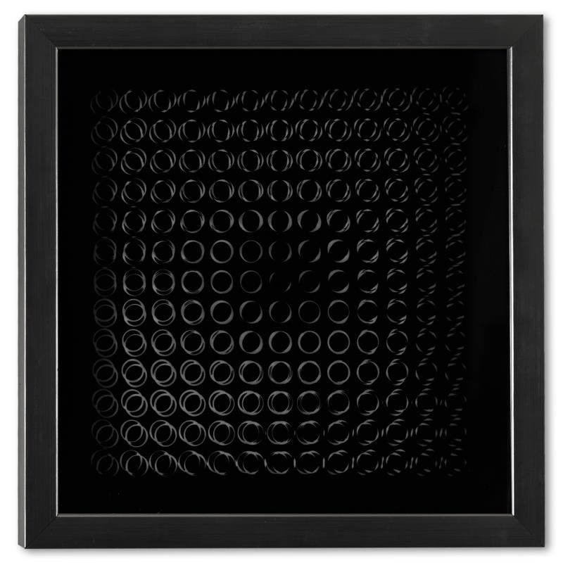 "Trois Dimensions Optique de la Serie Cinetiques" is a dimensional artwork, published in 1973, by Victor Vasarely (1908-1997). This piece comes custom framed, with a letter of authenticity and with a 1976 Vasarely paperback. Measures approx. 11.5" x 11.5" (frame), 9" x 9" (image).