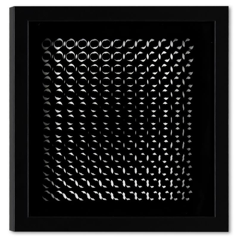 "Trois Dimensions Optique de la Serie Cinetiques" is a dimensional artwork, published in 1973, by Victor Vasarely (1908-1997). This piece comes custom framed. This piece comes with a catalogue raisonne of Vasarely's work with forward from Marcel Joray (paper back, published 1976). Includes Letter of Authenticity. Measures approx. 11.5" x 11.5" (frame), 9" x 9" (image).