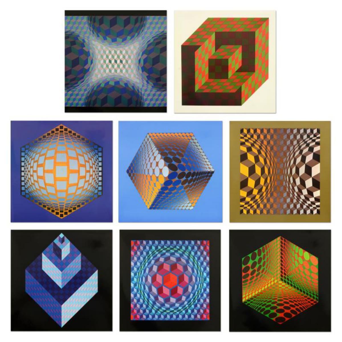 "Structure Universelles De L'hexagone Portfolio" includes 8 heliogravure prints on paper from the Editions du Griffon (1971) by Victor Vasarely (1908-1997). Each piece is titled and dated inverso. Each Piece measures approx. 10.5" x 10.5" (image). Reference #: 235985.