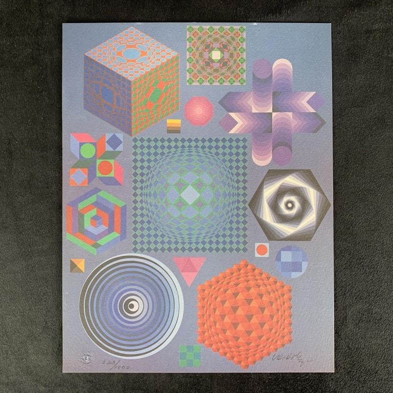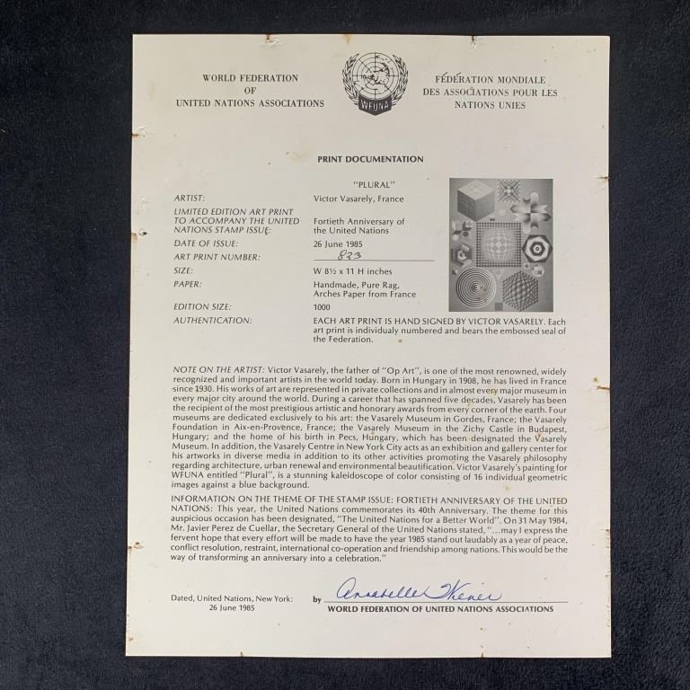 Victor Vasarely's "Plural, Fortieth Anniversary of the United Nations" limited edition print, signed lower right and numered 823/100 lower left. This piece is of geometric shapes, and is in excellent to mint condition. Included with certificate of authenticity from the World Federation of United Nations Associations