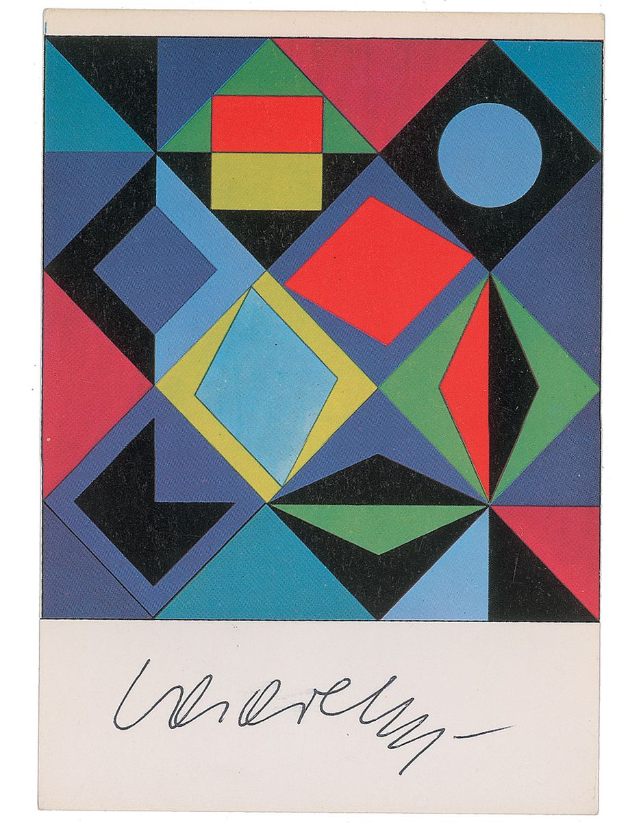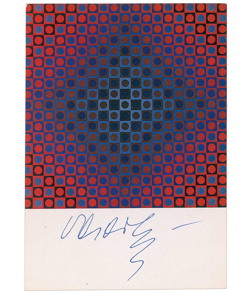 Two color postcards of Vasarely’s mesmerizing works, both 4 x 5.75, each signed in the lower border in blue or black ballpoint. In overall fine condition, with trivial corner tip dings.