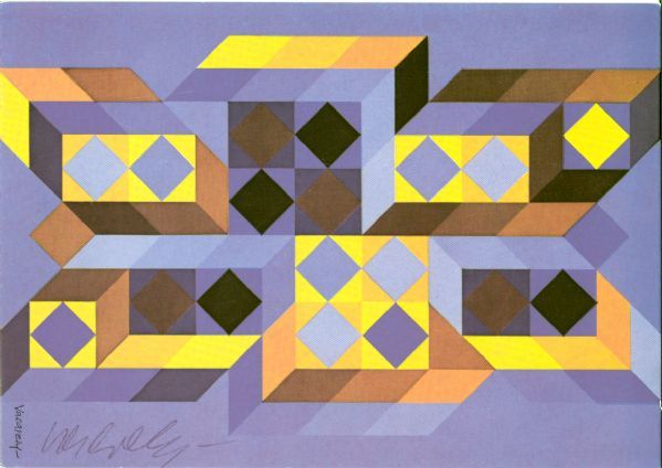 Color postcard of Vasarely’s colorful geometric works, 4 x 5.75, each signed at the bottom in ballpoint. fine condition.