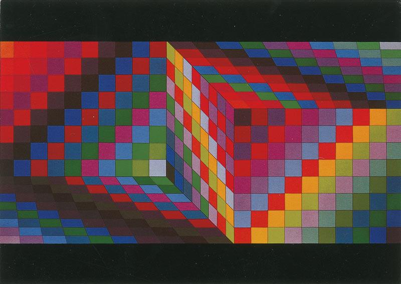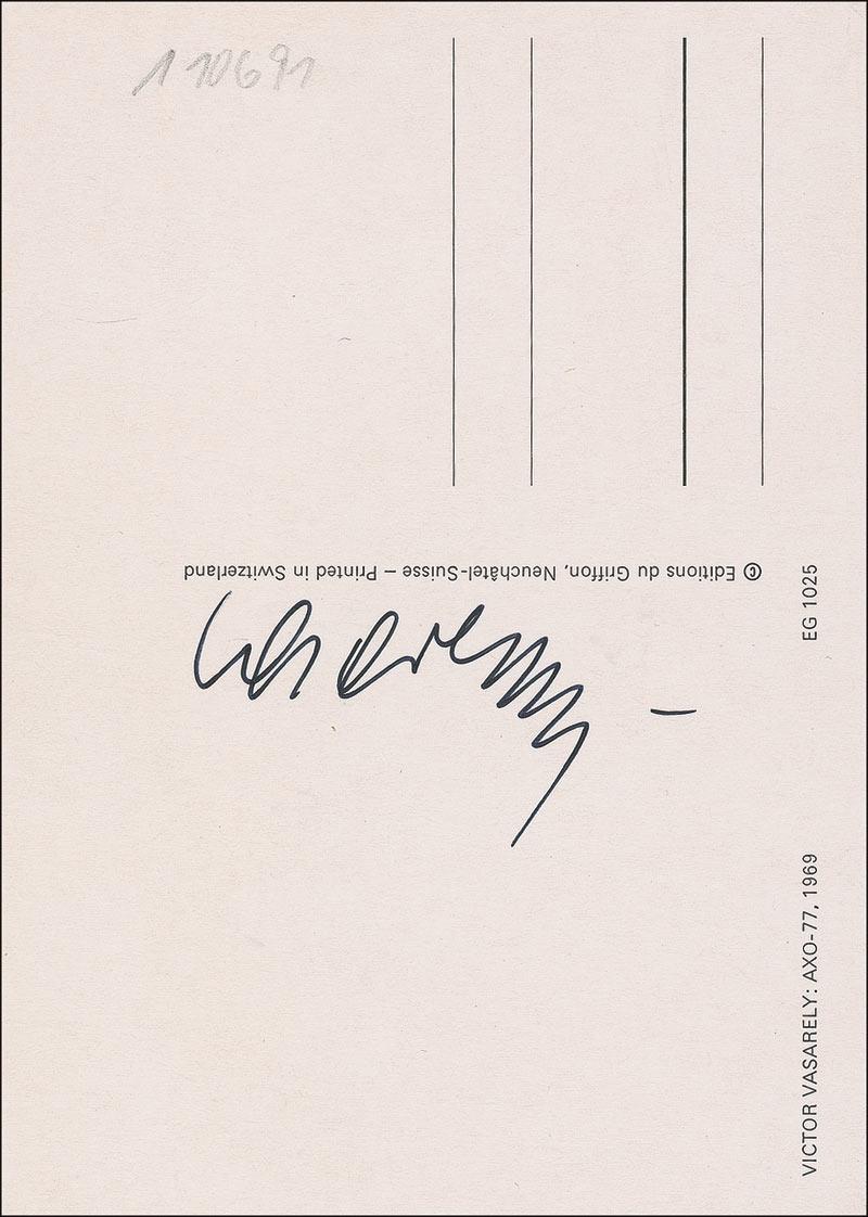 Pioneering Hungarian-born French artist (1906–1997) generally regarded as the founder of the “Op Art” movement that peaked during the psychedelic Sixties. Color 4.25 x 5.75 postcard photo of his work entitled AXO-77, signed on the reverse in black felt tip. In very fine condition. RRAuction COA.