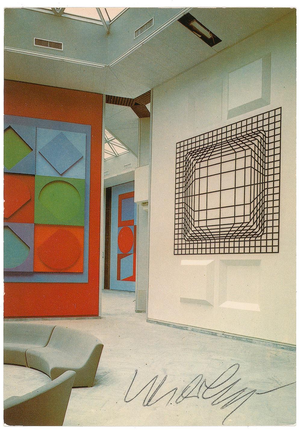 Pioneering Hungarian-born French artist (1906–1997) generally regarded as the founder of the Op Art movement that peaked during the Psychedelic Sixties. Color 4 x 5.75 postcard photo of the interior of the Vasarely Foundation building, signed in the lower border in black ballpoint. In fine condition.