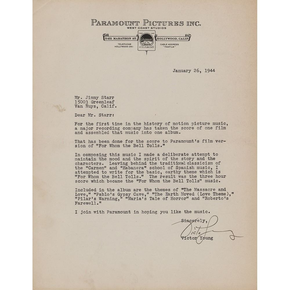 The classic Ernest Hemingway novel For Whom the Bell Tolls was adapted to the screen in 1943, starring Gary Cooper as Robert Jordan and Ingrid Bergman as Maria. Victor Young's soundtrack, which he discusses here in detail, became the the first complete score from an American film to be issued on record. A desirable and historic letter from a celebrated film composer.