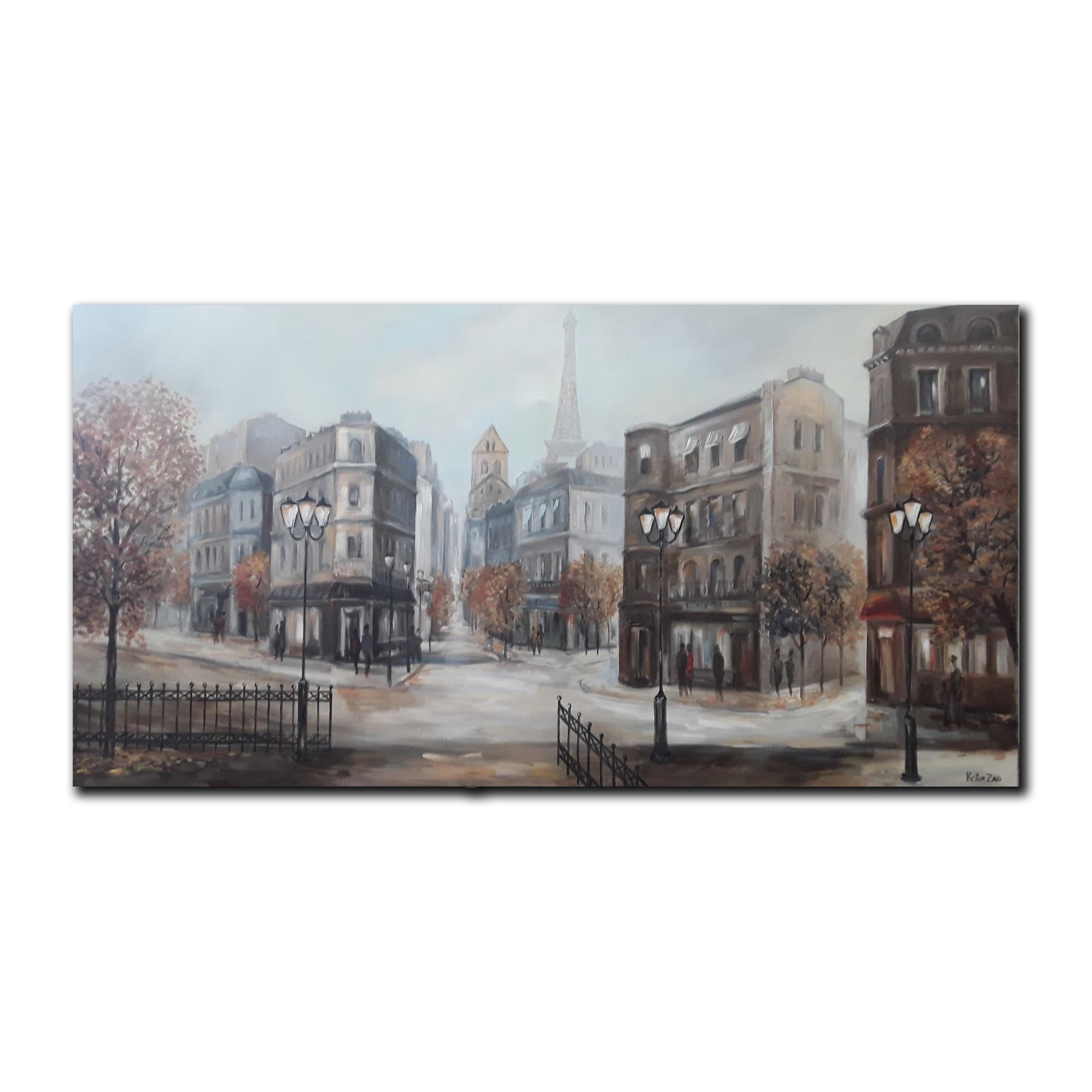 Original acrylic on canvas painting by Victor Zag. This piece is of a street scene in Paris. The Eiffel Tower can be seen in the background, with a number of buildings and people walking along the street, as well as fences and light poles in the foreground. This is an exclusive one time opportunity to acquire this original Victor Zag painting for this reserve price. The price that this piece is being offered at, is an extreme discount for the quality of this incredible work.