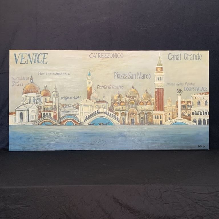 Victor Zag's "Venice" original acrylic on canvas painting, signed lower right. This piece is a skyline scene of the Venice, highlighting the Bridge of Sight, Ponte Dell Arsenale, Piazza San Marco, and more. This painting is in excellent condition and has been professionally stretched over a stretcher board.