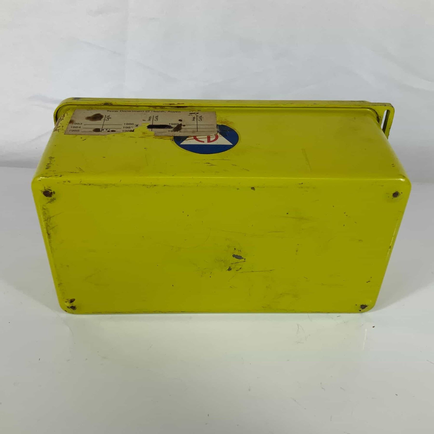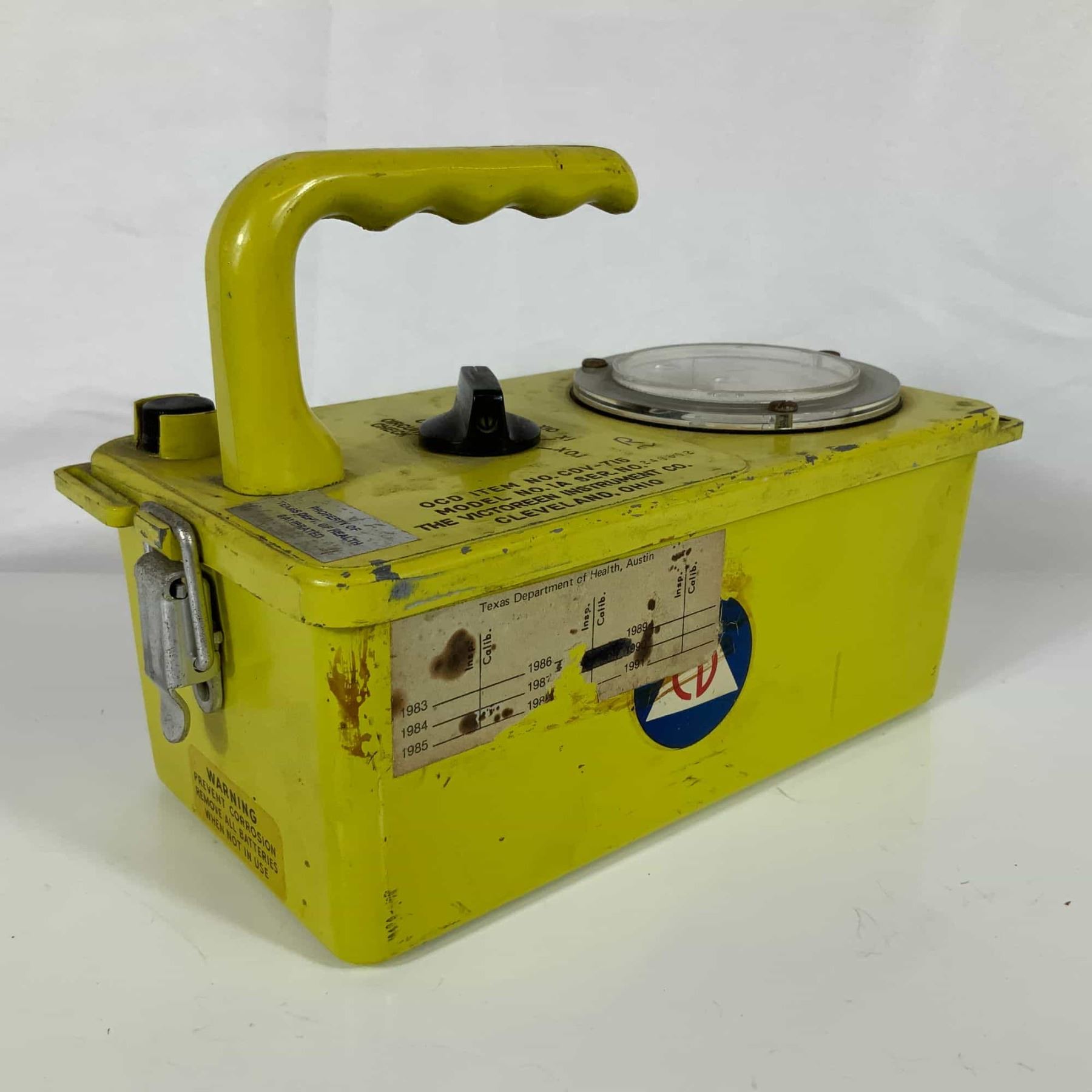 This is a vintage Victoreen Model 1A CDV-715 radiological survey meter, an ion chamber instrument originally commissioned for the United States Office of Civil Defense. The unit is constructed with a rectangular metal housing finished in yellow paint and features a top-mounted metal carrying handle and a black plastic selector knob. The face of the instrument is marked with the following text: OCD ITEM NO. CDV-715, MODEL NO. 1A SER. NO. 248692, THE VICTOREEN INSTRUMENT CO., and CLEVELAND, OHIO. The analog dial features a scale from 0 to 5 r/hr (Roentgens per hour) and is marked 715-16-29. The selector switch includes positions for OFF, CIRCUIT CHECK, ZERO, X100, X10, X1, and X0.1. The side of the case bears the official blue, white, and red Civil Defense logo. This specific instrument includes a silver sticker from the Texas Department of Health indicating it was property of the state and calibrated. An additional paper label on the side from the Texas Department of Health in Austin shows an inspection and calibration grid with handwritten entries dating from 1983 to 1991. A warning printed on the front reads WARNING PREVENT CORROSION REMOVE ALL BATTERIES WHEN NOT IN USE. The housing is secured by two metal side latches.