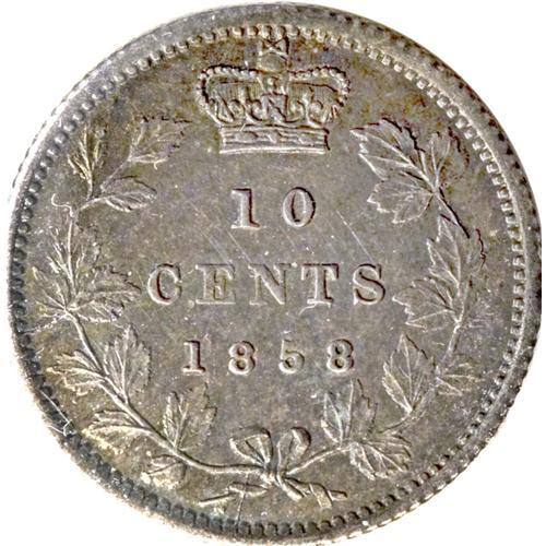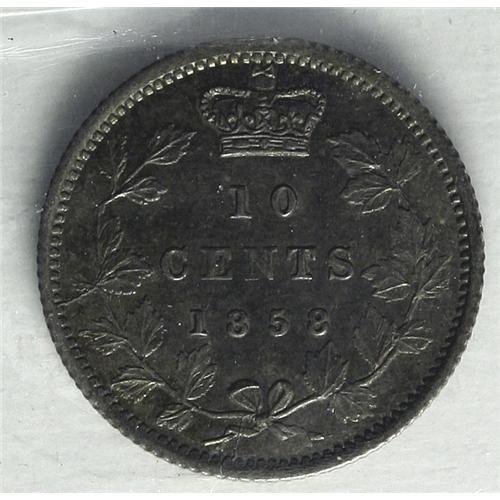 <B>Victoria 10 Cents 1858, </B></I>KM3, MS63 ICCS, deep original toning with some hints of blue and sea-green, significantly scarce in this superior quality.<BR><I>From the Dominion Collection.</B></I>