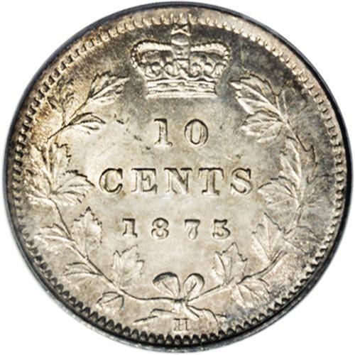 <B>Victoria 10 Cents 1875H, </B></I>Ex: Belzberg Collection, KM3, MS64 PCGS, an amazing example of this rare date with gorgeous deep patina and full underlying mint luster. There is a tiny toning spot on the bust which does not distract. Only one other specimen has been graded MS64 by PCGS. A chance to own a coin of legendary rarity and pedigree.<BR><I>From the Dominion Collection.</B></I>