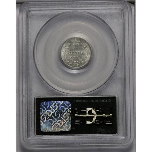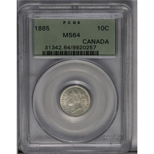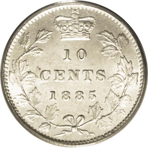 <B>Victoria 10 Cents 1885, </B></I>KM3, MS64 PCGS Obverse 4 and ICCS MS64, full frosty white mint luster with virtually no toning, an incredibly attractive example of this low mintage date in extremely rare quality - only three coins have been graded higher by PCGS, all MS65.<BR><I>From the Dominion Collection.</B></I>