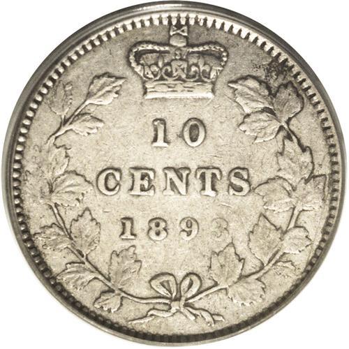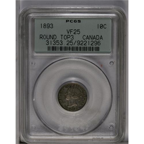 <B>Victoria 10 Cents 1893 Round Top 3, </B></I>KM3, VF25 PCGS and VF20 ICCS, the coin currently in the PCGS holder. Very rare variety and a pleasing example with original medium gray toning.<BR><I>From the Dominion Collection.</B></I>
