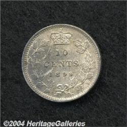 <B>Victoria 10 Cents 1899 Small 9's, </B></I>KM3, AU-UNC, a nice original coin with deep gray patina. <BR><BR><B>Important notice:</B> Heritage usually auctions material at the rate of 200-250 lots per hour. On some occasions eBay Live bid software or the Internet may not be able to keep up with the pace of the auction. We recommend placing a realistic absentee bid now as insurance to avoid disappointment. Occasionally the auctioneer may eliminate or reject an eBay Live bid, and the auctioneer may also reopen a lot after the close of the eBay live bidding (usually because we missed an audience bid), and may reject your bid even if it shows you as the winning bidder. By bidding via eBay Live, you agree that Heritage may award the lot to another bidder at its sole discretion under the circumstances described above or any other reasonable circumstances. Since eBay bids are not shown to us until we open the lot on the floor, we treat those bids just like floor bids. In most cases the floor responds before the eBay bid is presented to us, due to Internet lag time, so for consistency we have made it a policy that floor bids are always considered first over tie eBay live bids. Also please note that all Heritage lots purchased through eBay Live carry a 20% Buyer's Premium. Please make sure you read the Terms and Conditions before you bid.