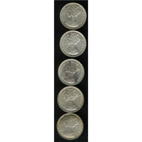 <B>Victoria 10 Cents - Date Selection, </B></I>KM6.3, five coins featuring: 1891, nice AU, 1892, lustrous AU, 1893, choice UNC, slightly mottled patina, 1894, AU-UNC and 1896, toned AU. <B>Sold as is, no return lot.</B></I>