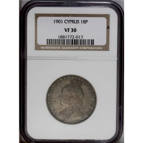 <B>Victoria 18 Piastres 1901, </B></I>KM7, VF30 NGC, even slate gray patina with some underlying sheen.