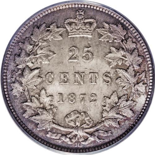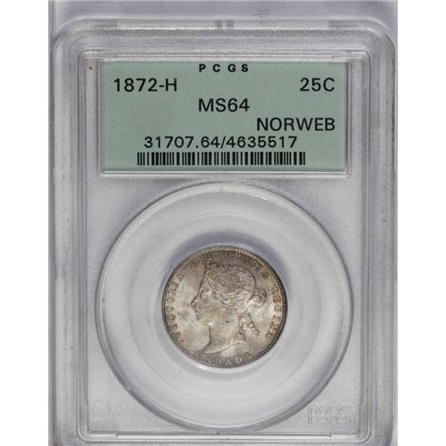 <B>Victoria 25 Cents 1872H, Obverse 2,</B></I> Ex: Norweb Collection, KM5, MS64 PCGS. Nicely struck and lustrous with attractive steel-gray toning and gold accents.<BR><I>From the Dominion Collection.</B></I>