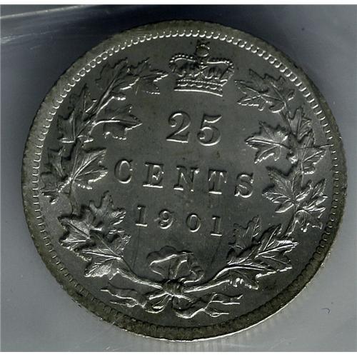 <B>Victoria 25 Cents 1901,</B></I> KM5, MS63 ICCS. Fully struck with nice mint frost and light golden toning.<BR><I>From the Dominion Collection.</B></I>