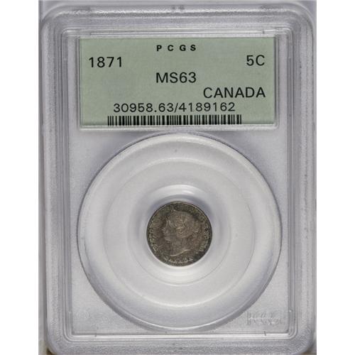 <B>Victoria 5 Cents 1871,</B></I> KM2, MS63 PCGS. Sharply struck with a prooflike obverse and mottled gray and gold toning.<BR><I>From the Dominion Collection.</B></I>