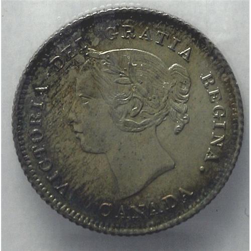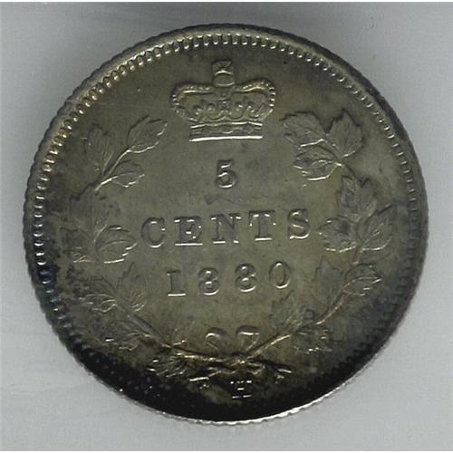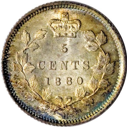 <B>Victoria 5 Cents 1880-H,</B></I> KM2, MS63 ICCS. Sea-green central toning with bands of cobalt-blue around the peripheries and full underlying luster.<BR><I>From the Dominion Collection.</B></I>