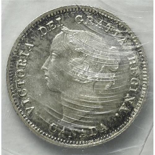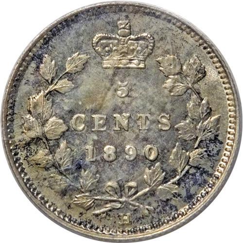 <B>Victoria 5 Cents 1890-H,</B></I> KM2, MS67 ICCS. Sharply struck with satiny, near-flawless surfaces and light golden toning. Both sides display scattered areas of charcoal-gray coloring around the peripheries. Even though ICCS lists one piece certified finer, this cataloger cannot imagine the coin that would be nicer. A truly spectacular example.<BR><I>From the Wellington Collection..</B></I>