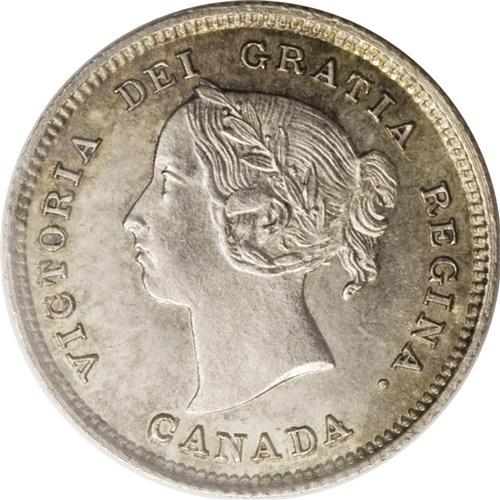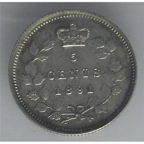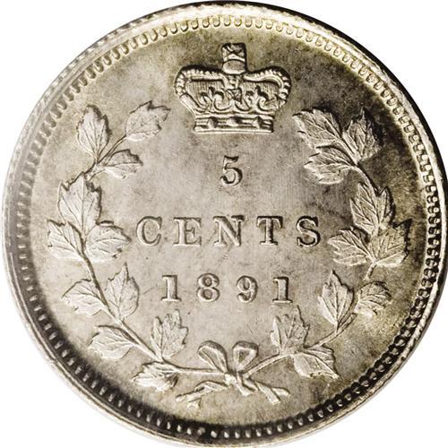 <B>Victoria 5 Cents 1891,</B></I> KM2, Obverse 5, MS64 ICCS. Full mint brilliance with light golden-russet toning. Only two pieces have been certified finer by ICCS.<BR><I>From the Dominion Collection.</B></I>