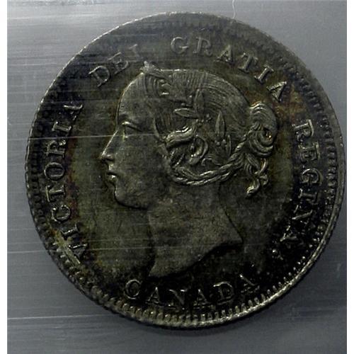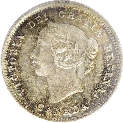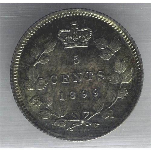 <B>Victoria 5 Cents 1899,</B></I> KM2, MS65 ICCS. Superbly struck with argent-gray toning and golden highlights. No significant marks are present and the overall eye-appeal is spectacular.<BR><I>From the Dominion Collection.</B></I>