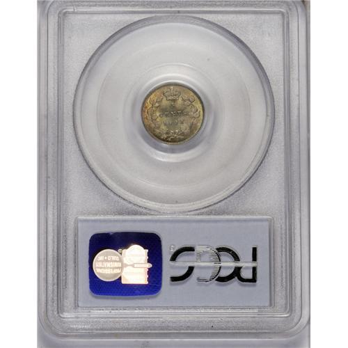 <B>Victoria 5 Cents 1901,</B></I> Ex: Belzberg Collection, KM2, MS66 PCGS. Sharply struck with pristine surfaces and superb gold and sea-green toning. No examples have been certified finer by PCGS or ICCS and for the one other PCGS coin and three ICCS coins certified MS66, we do not hesitate to say that none could be nicer than this piece in overall appearance.<BR><I>From the Wellington Collection..</B></I>