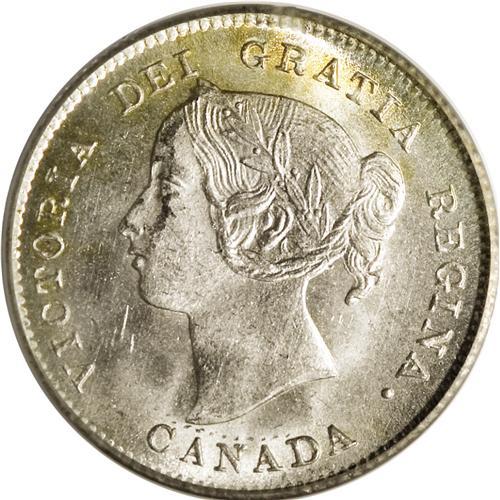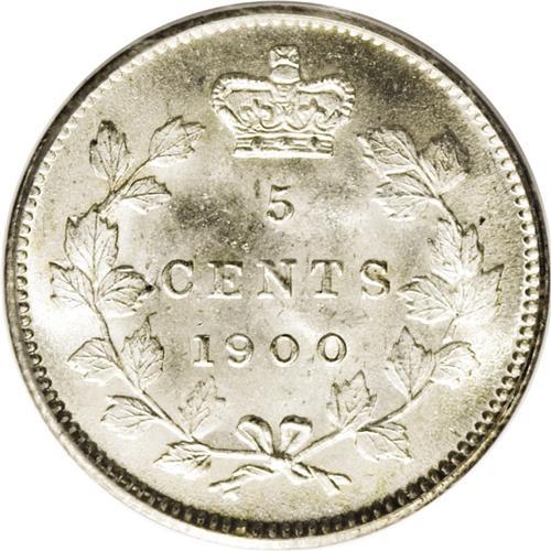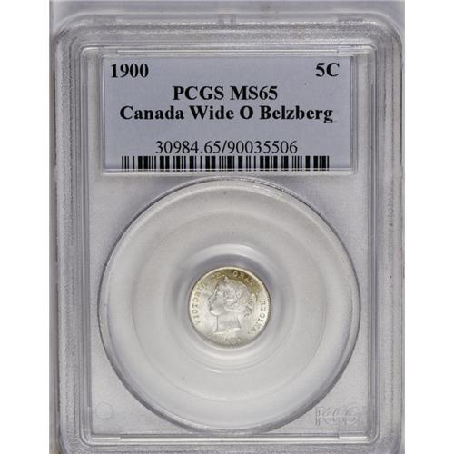 <B>Victoria 5 Cents 1900 Wide 0,</B></I> Ex: Belzberg Collection, KM2, MS65 PCGS. Frosty-white with a dash of golden color around the upper obverse periphery.<BR><I>From the Dominion Collection.</B></I>