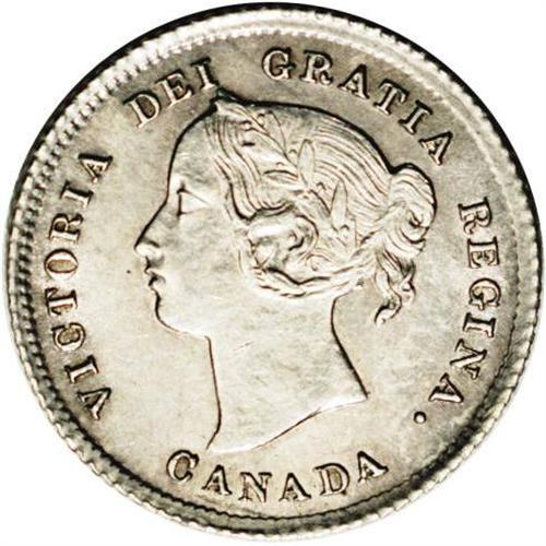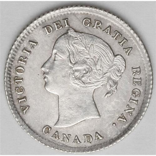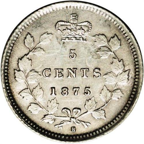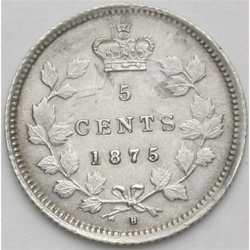 <B>Victoria 5 cent silver 1875H Small Date,</B></I> KM2, choice AU, this key date coin is seldom seen in high grade and the Canadian grading service ICCS has only graded 13 pieces in AU.
