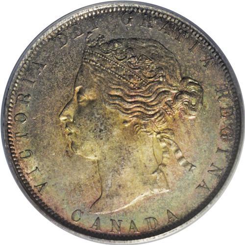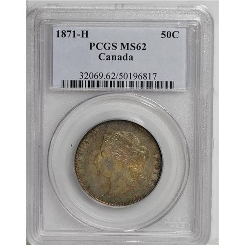 <B>Victoria 50 Cents 1871H,</B></I> KM6, MS62 PCGS. Well struck and deeply toned in shades of gold and argent-gray with hints of blue. Equal in grade to the Mason specimen that brought over $17,000 Canadian in 2002. The first Heaton Mint coin struck for Canada and very elusive in Mint State.<BR><I>From the Dominion Collection.</B></I>