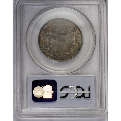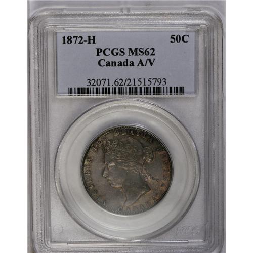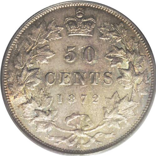 <B>Victoria 50 Cents 1872H A/V,</B></I> KM6, MS62 PCGS. Nicely struck with slate-gray and gold toning with a touch of steel-blue peripheral color on the obverse. Moderately abraded with underlying luster. This is the extremely rare variety with the inverted A for V in VICTORIA. One of the rarest of all the Victoria 50 Cents issues in high grade. The Belzberg Collection piece was XF40 PCGS and the Mason Collection specimen was also an XF40 PCGS. There was no example in either the Norweb or Pittman Collections. This is the single Mint State example certified by PCGS or ICCS.<BR><I>From the Dominion Collection.</B></I>