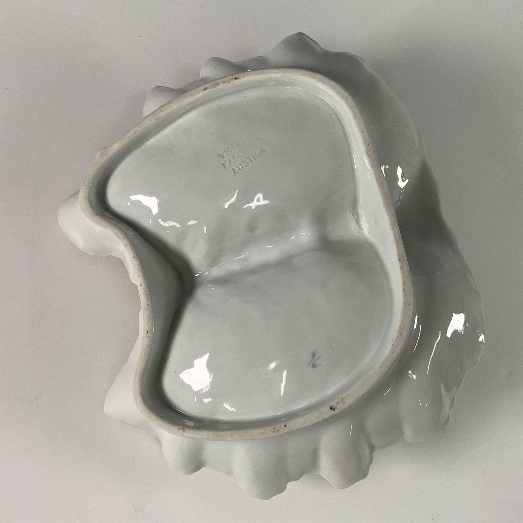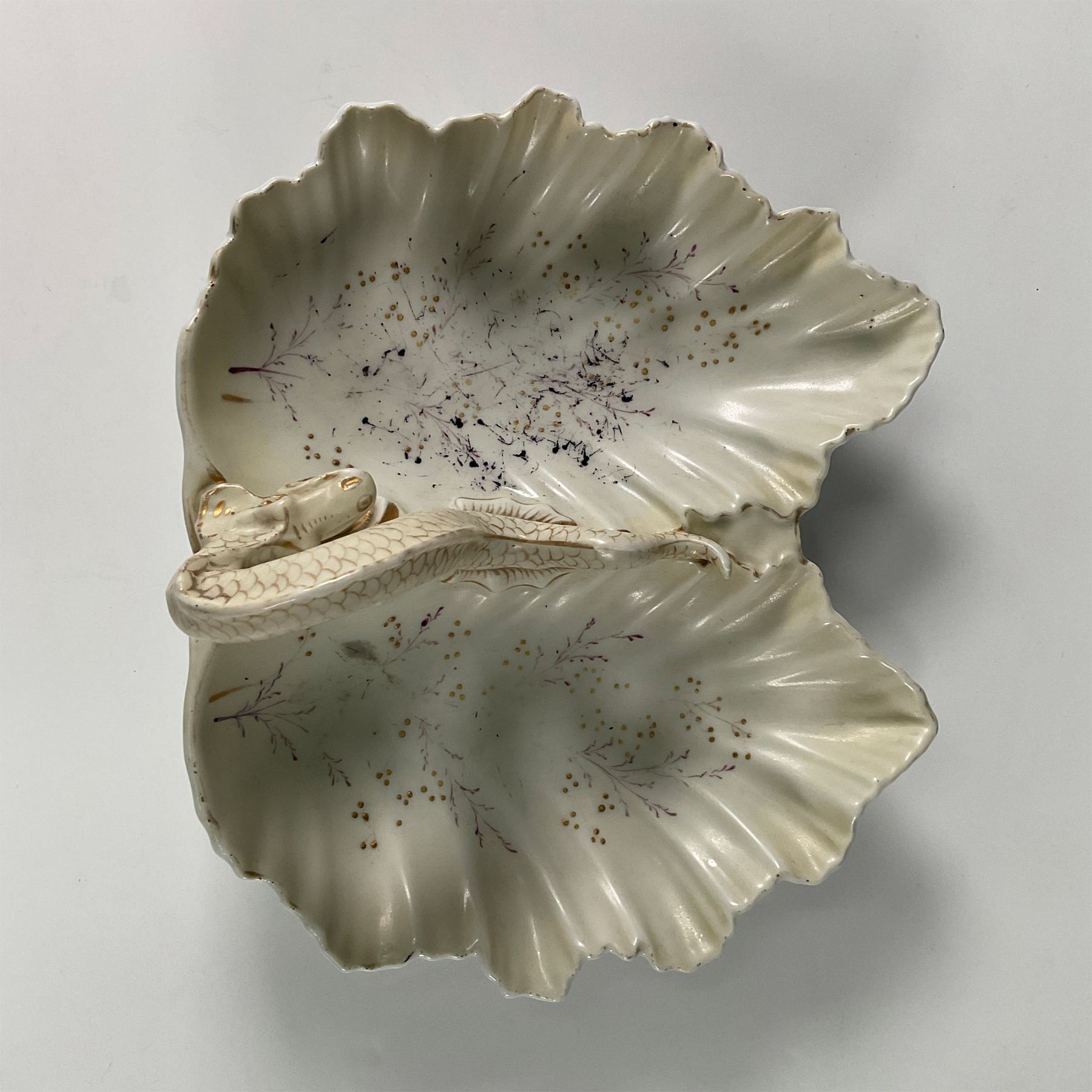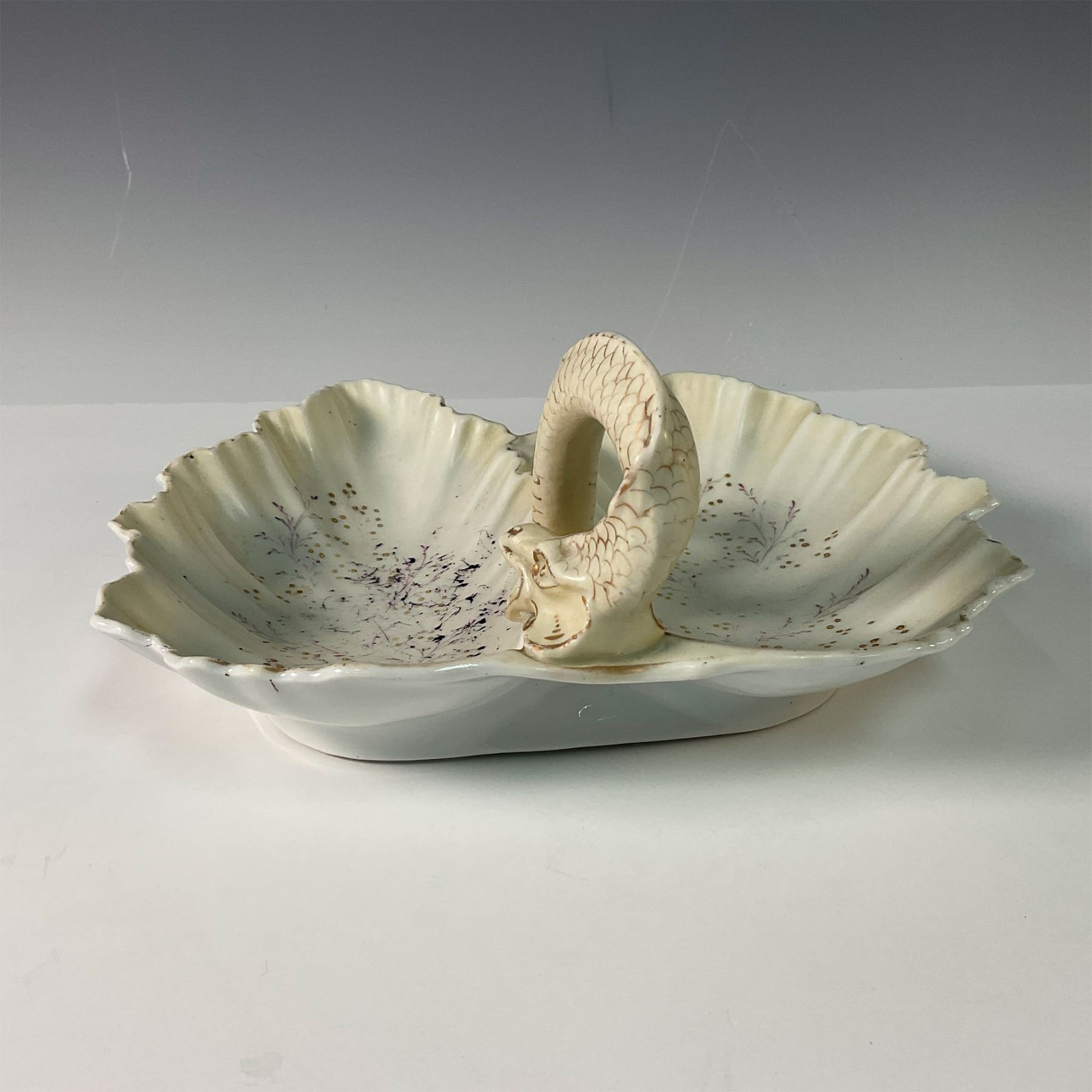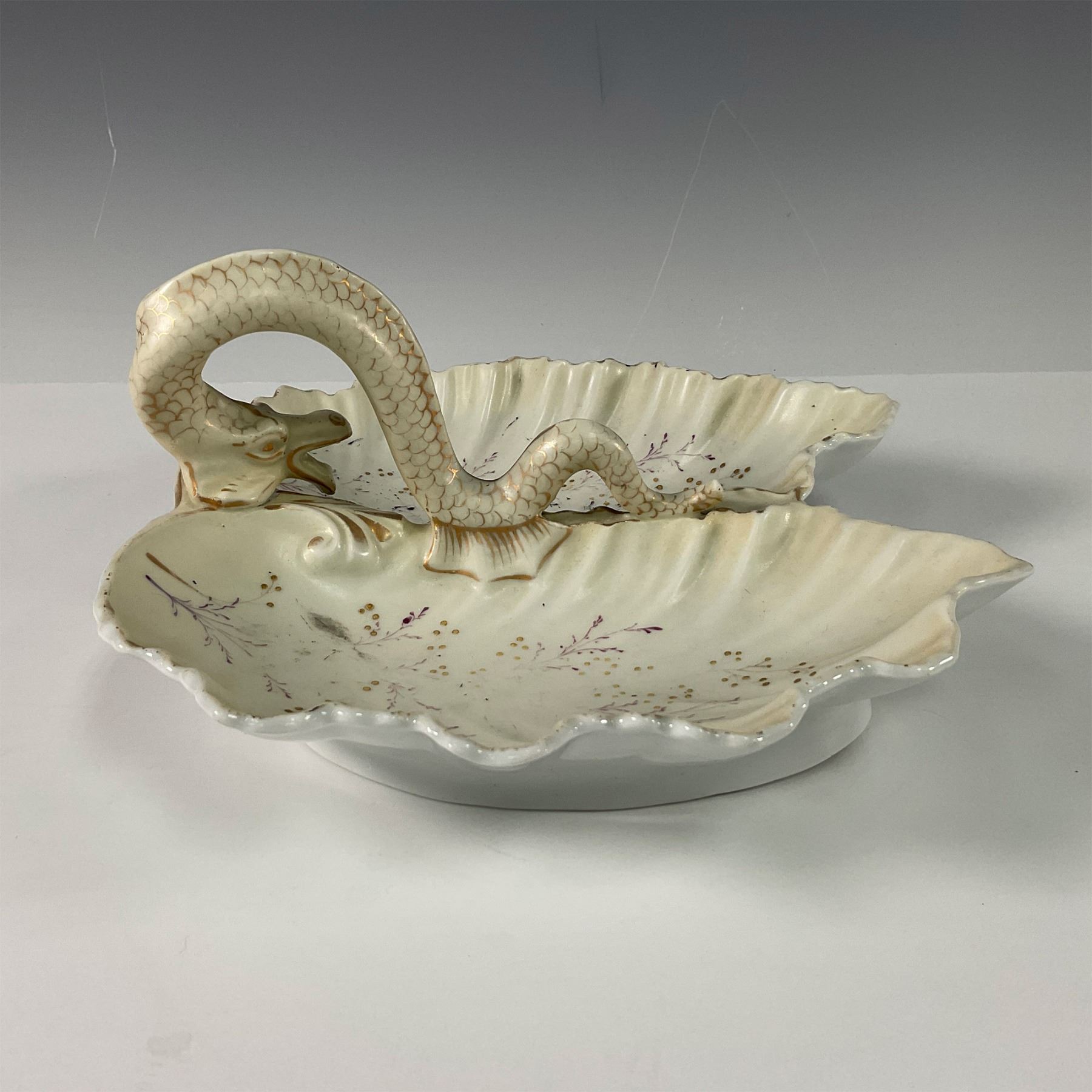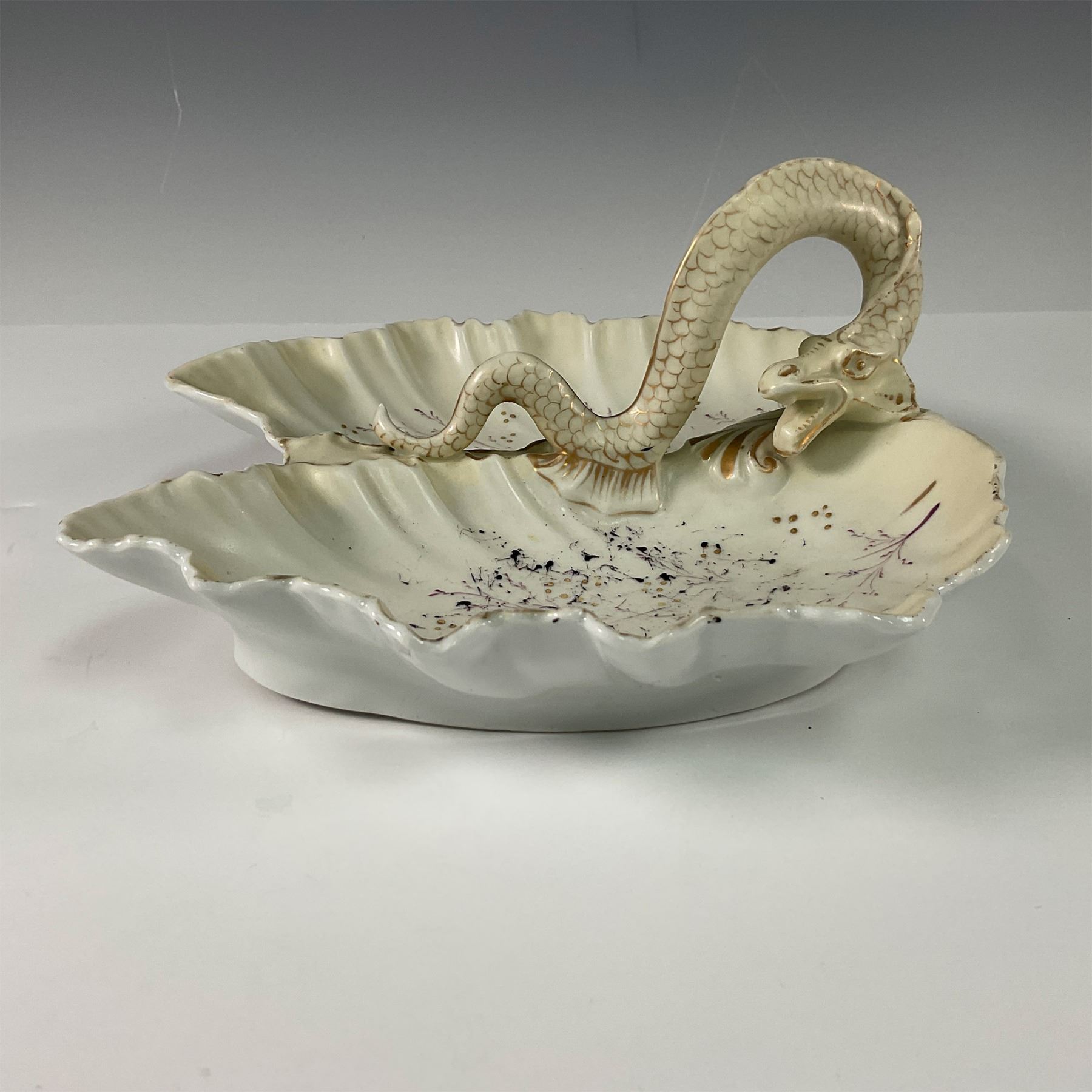 This distinctive porcelain divided serving bowl is a testament to the fine craftsmanship of Victoria in Karlsbad, Austria. The bowl features two scalloped compartments adorned with delicate floral motifs and gilded accents. The centerpiece is an intricately designed handle, shaped as a medieval sea creature, complete with detailed scales and expressive features. The elegant design and unique handle make this piece both functional and decorative, perfect for serving or display. This remarkable creation exemplifies the artistry of Austrian porcelain, blending whimsy with elegance. Victoria Karlsbad Austria impressed on the underside.