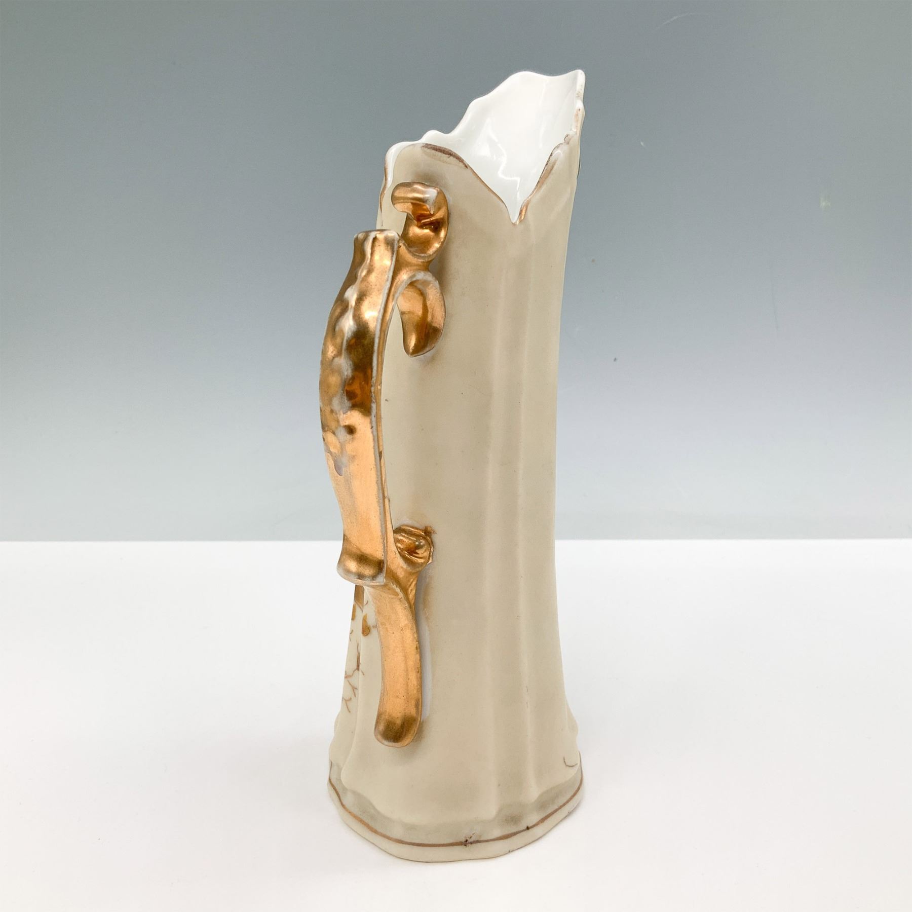 Victoria Carlsbad Austrian porcelain ewer featuring an elegant hand-painted floral motif with gold accents. The pitcher showcases a gracefully curved handle with ornate gilding and a scalloped rim. The body is adorned with delicate white flowers against a cream-colored background, enhanced with gold detailing. Marked Victoria Carlsbad Austria on the base. A fine example of late 19th to early 20th-century Austrian porcelain craftsmanship.