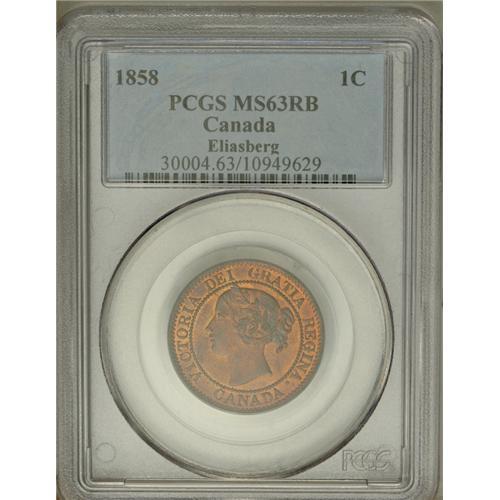 <B>Victoria Cent 1858, </B></I>KM1, MS63 PCGS Red & Brown Eliasberg, a choice and fully original example of this key first date with abundant mint luster.<BR><I>From the Louis E. Eliasberg, Sr. Collection</B></I><BR><BR><b>Shipping:</b> Coin/Currency (<a target="_blank" href="http://www.heritageauctions.com/common/shipping.php">view shipping information</a>)