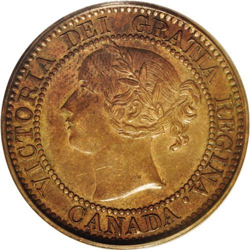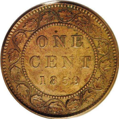 <B>Victoria Cent 1859 Dpn9 T1,</B></I> KM1, AU55 PCGS, this is the key type coin for the Canadian large cent series. The reverse is slightly rotated.