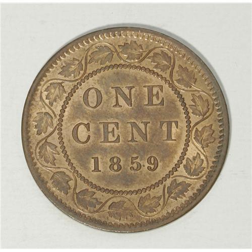 <B>Victoria Cent 1859 Narrow 9, </B></I>KM1, choice lustrous UNC, a very attractive example and fully original.<BR><I>From the Louis E. Eliasberg, Sr. Collection</B></I><BR><BR><b>Shipping:</b> Coin/Currency (<a target="_blank" href="http://www.heritageauctions.com/common/shipping.php">view shipping information</a>)